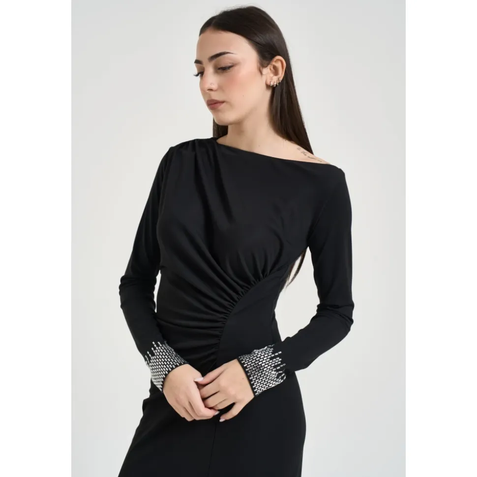 Liu Jo Elegant Kjole med Ædelsten er en lang, figursyet festkjole, der defineres af en draperet front og ædelstensbesatte ærmemanchetter. Ideel til aftenarrangementer, den kombinerer en bådudskæring med en slank, kropsnær silhuet. Nøgleattributter: Sort | Polyester | Bådudskæring | Lange ærmer | Draperet frontdetalje | Rhinestensbesatte ærmemanchetter | Mål & pasform: Modelhøjde: 172 cm; iført størrelse S | Lang længde | Figursyet silhuet | Sammensætning & pleje: 92% Polyester | 8% Elastan | Håndvask; må ikke bleges; må ikke renses; vaskes med vrangen ud; gnid ikke under vask; må ikke tørretumbles; stryges ved maks. 110°C med en klud imellem.