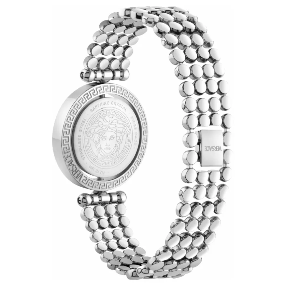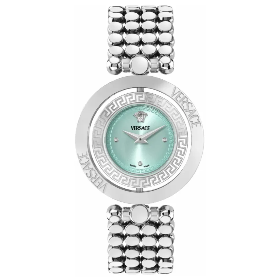 Versace Eon Restyling Watch kombinerer et sølvfarvet urkasse i rustfrit stål med en livlig turkis urskive, hvilket giver et raffineret hverdagsur. Designet understreger rene linjer og en markant farvet urskive. Vigtige egenskaber: Grå | Sølv | Rustfrit stål | Turkis urskive | Sølvfarvet urkasse | Sammensætning og pleje: Rustfrit stål
