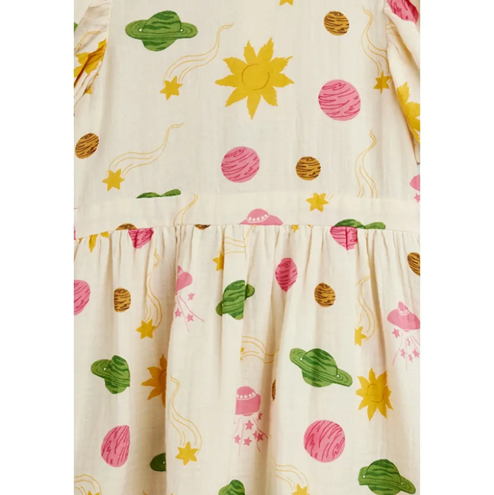Mini Rodini Farverig Kjole med Print kombinerer et detaljeret kosmisk print med en blød bomuldskonstruktion for nem hverdagsbrug. Designet balancerer legende mønstre med raffinerede detaljer for en tidløs, komfortabel silhuet. Nøgleattributter: Beige | Creme | Bomuld | Blød overflade | Åndbart stof | Knaplukning bagpå | Elastiske ærmekanter | Defineret taljesøm | Peter Pan-krave | Pufærmer med elastiske manchetter | Let udstillet skørt | Kosmisk print med planeter, sole, stjerner og kometer | Farvekoordinerede knapper bagpå | Taljesøm | Dimensioner og pasform: Afslappet pasform | Let udstillet silhuet | Sammensætning og pleje: 100% bomuld | Maskinvask ved 40°C.