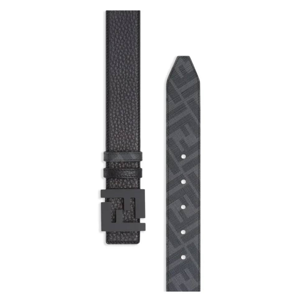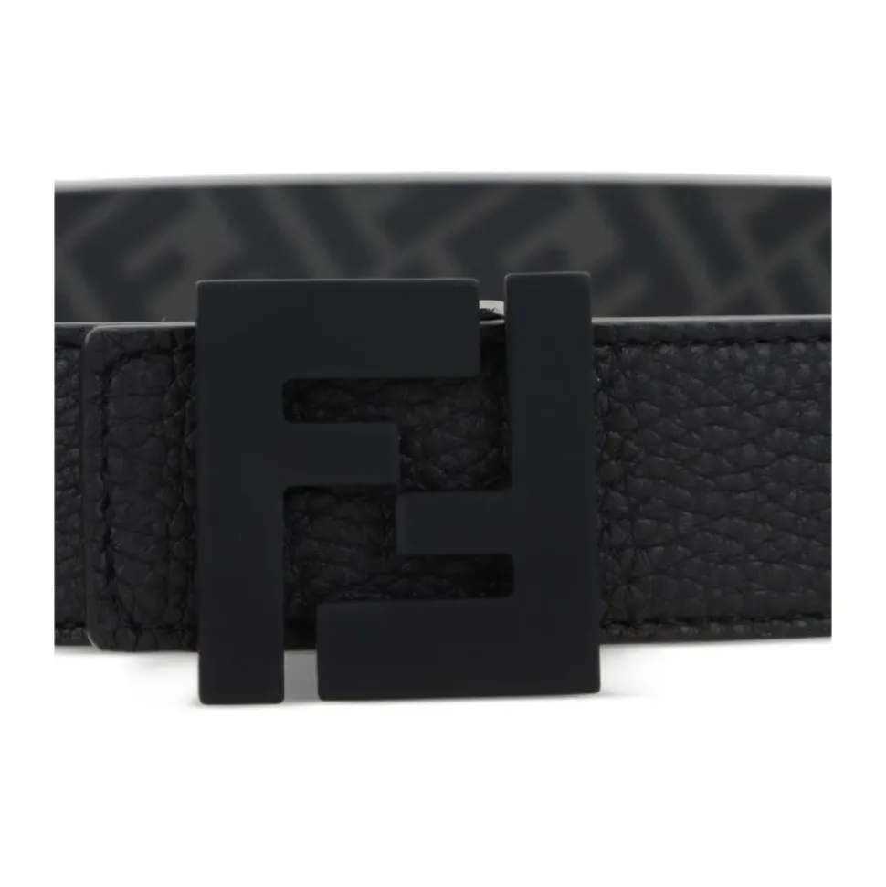 Fendi FF Bælte er et vendbart læderbælte, der kombinerer et signatur FF-studspænde med en tofarvet foring. Ideelt til at tilføje et raffineret, brandet touch til skræddersyede eller afslappede outfits. Nøgleattributter: Sort | Cuoi o Romano læder | Vendbart design | Justerbar pasform med spænde | To bæltestropper | Ikonisk FF-studspænde | FF-motivforing i grå og sort | Sort emaljeret metalvare | Dimensioner og pasform: Bredde: 3,5 cm | Justerbar pasform | Fås i flere længder (se størrelsesguide) | Sammensætning og pleje: 100% læder