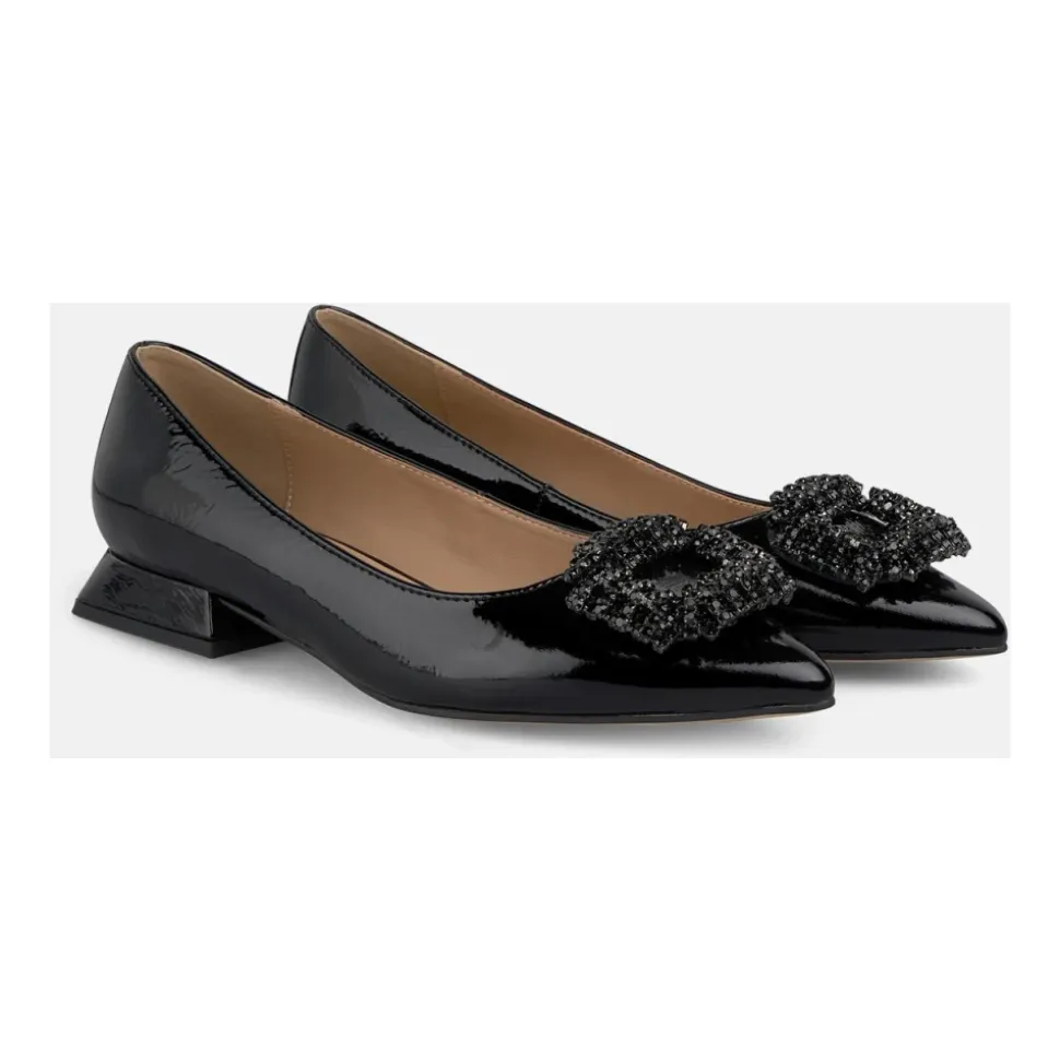 Dameflad sko med en cirkulær strassudsmykning på tåen. Ingen lukning og spids tå. Hælhøjden er 2 cm.