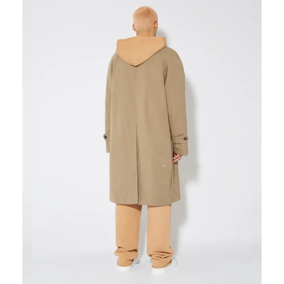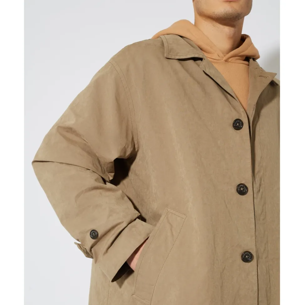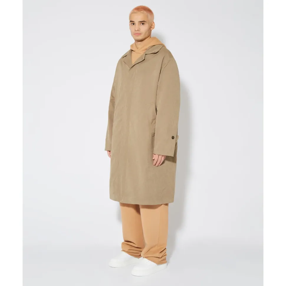Urban-stil trenchcoat lavet af teknisk bomuldsstof med raglanærme på skuldrene, bagventilation og tøjler på håndledene.