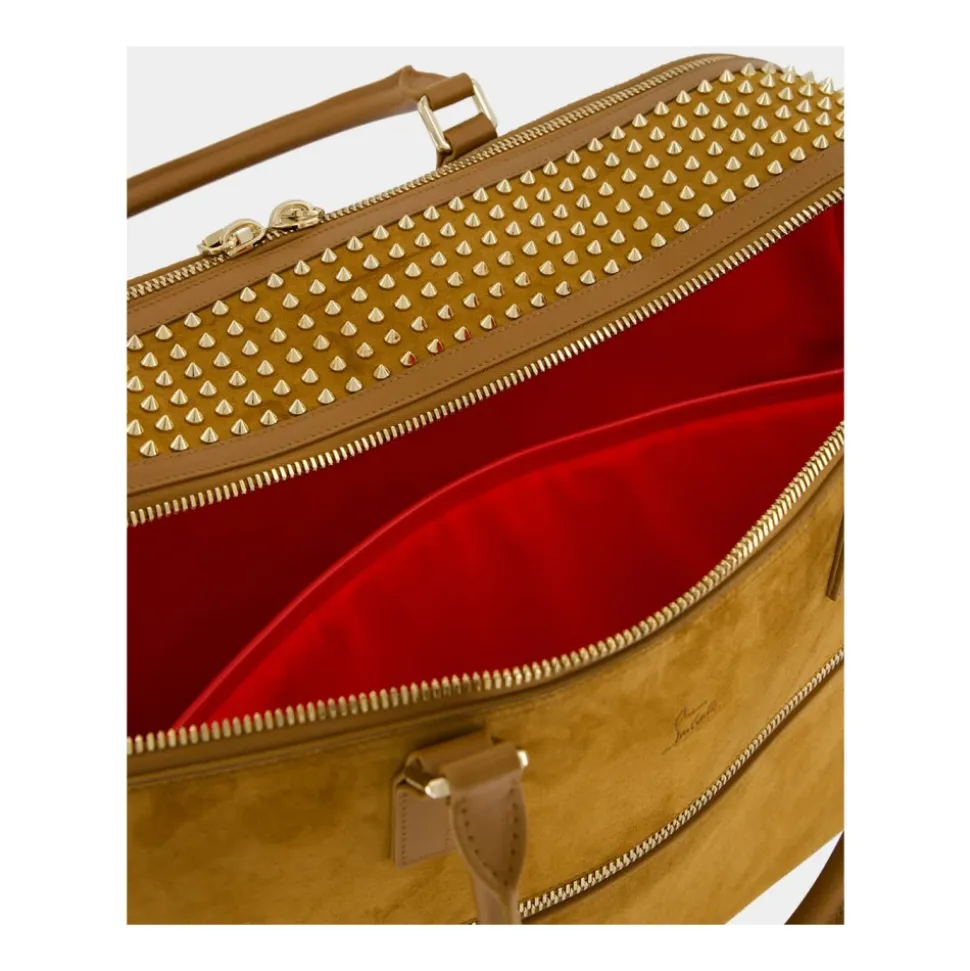 Christian Louboutins Funky Duffle Bag kombinerer sporty linjer med Maisons signatur-guldspikes og skaber en markant carryall, der er klar til rejsen. Vigtige egenskaber: Rhea brun | Guld | Vendt kalveskind | Letvægt | Smidigt læder | Dobbelte 15 cm hanke | Aftagelig justerbar skulderrem | Hovedrum med dobbelt lynlås | Laptoprum | Lynlåslommer | Gyldne metalliske spikes på toppen | Lasergraveret signatur på bunden | Sporty silhuet | Nubuck finish | Dimensioner og pasform: H 22 x L 53 x B 21 cm | Sammensætning og pleje: Vendt kalveskind | Spikes | Specialist læderrensning