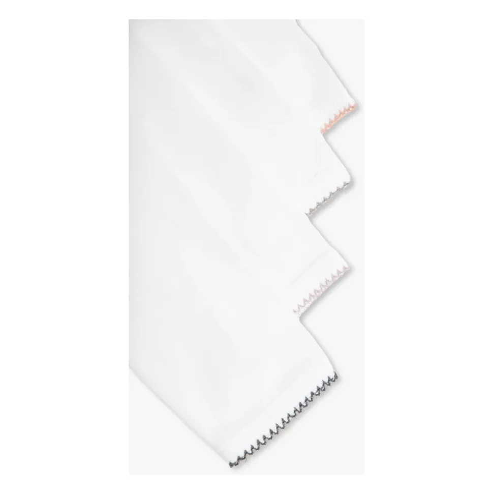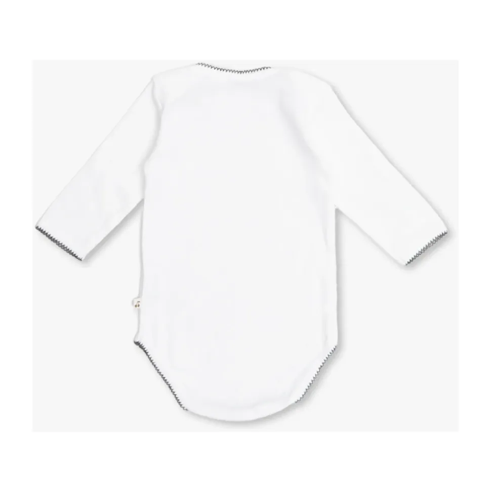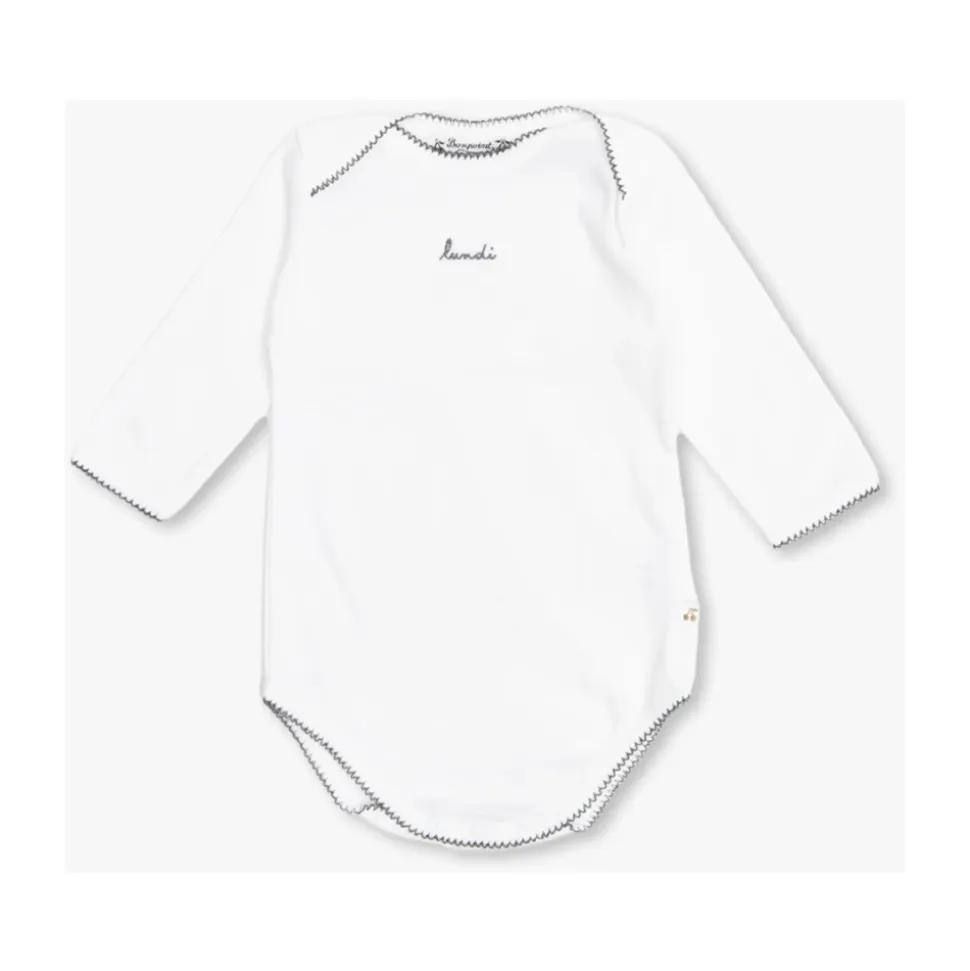 Gaveæske fra Bonpoint. Den inkluderer en hvid bomuldsbody 7-pakke med broderede ugedage, trykknaplukning, lange ærmer og kontrastfarvede kanter, en grålig beige kaninmascot og en tandæske med mærket.