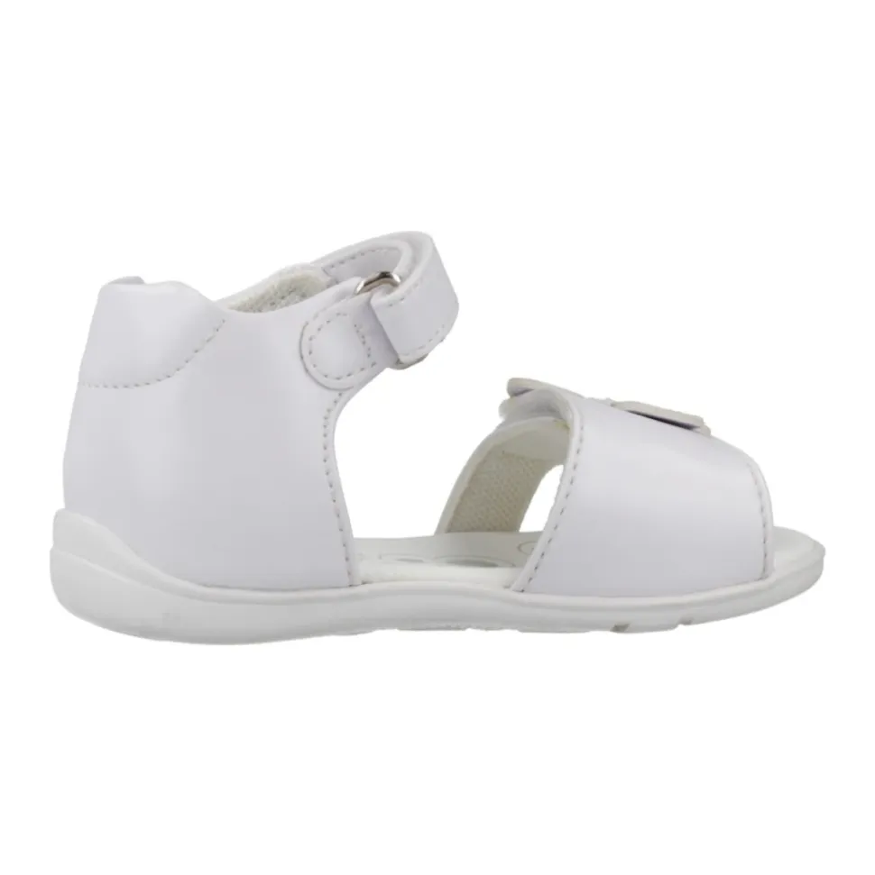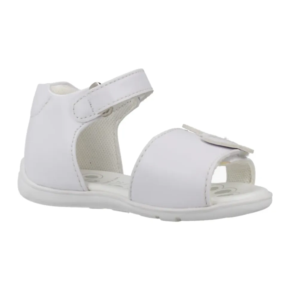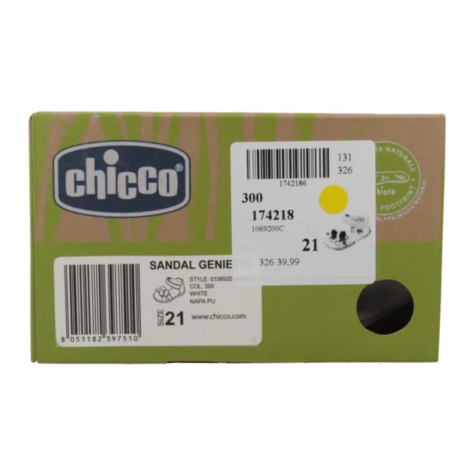 Chicco Genietta Sandal er en let og nem sandal, der er designet til hverdagsbrug. Den kombinerer en syntetisk overdel med en fleksibel gummisål og justerbare remme for nem på- og aftagning og sikker pasform. Vigtige egenskaber: Hvid | Syntetisk | Fleksibel ‘Flex-zone’ gummisål | Støttende indersål med logo (Natural Chicco) | Justerbare dobbelt velcroremme | Lukning med velcro (klæbende tape) | Rund tå | Sommerfugl-applikation (dekorativ) | Sammensætning og pleje: Overdel: Syntetisk | Foring og indersål: Tekstil, Syntetisk | Ydersål: Gummi