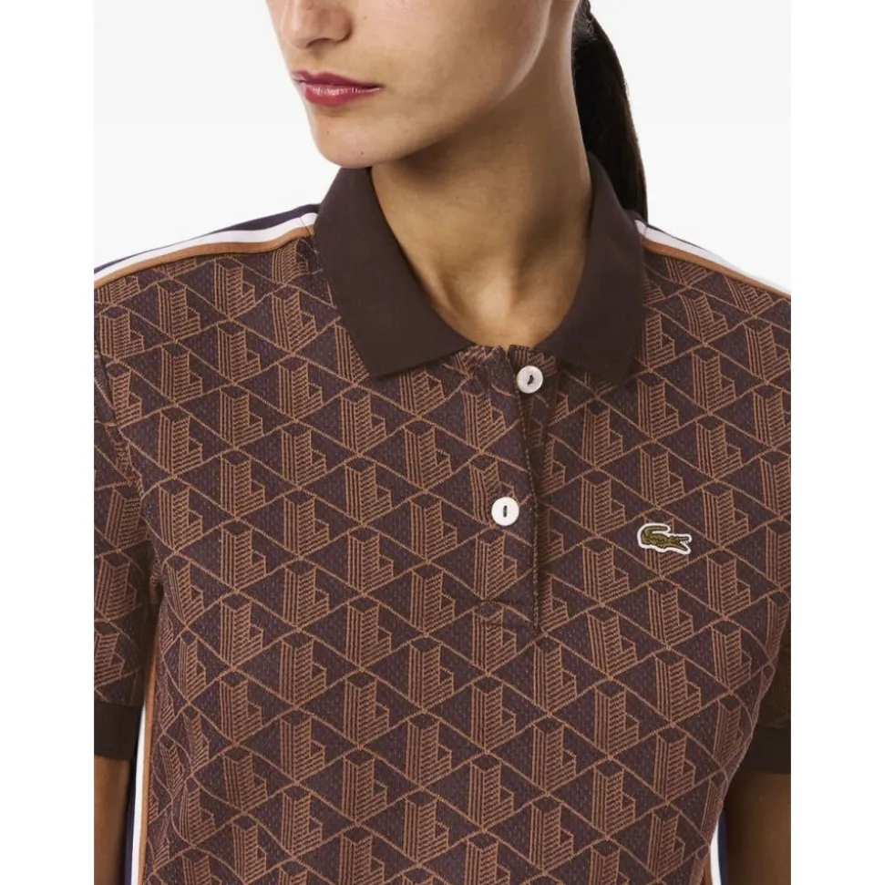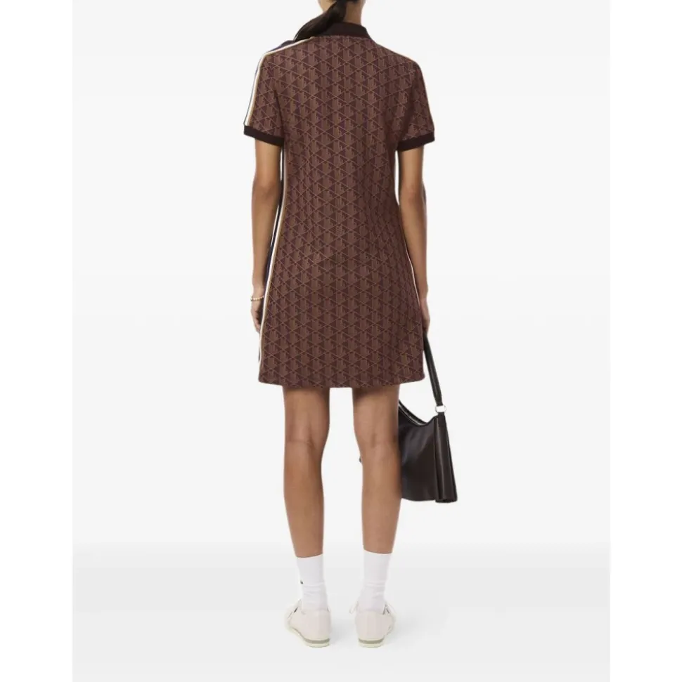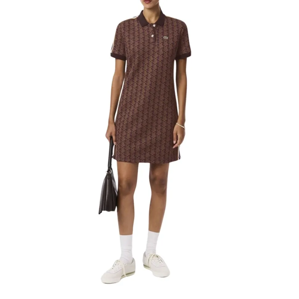 Lacoste geometrisk mønstret polokjole kombinerer en klassisk polo silhuet med et dristigt geometrisk print. Designet har en polokrave, korte ærmer og knaplukning med sidestribede detaljer for ubesværet hverdagsbrug. Vigtige egenskaber: Brun | Knaplukning | Sidestribet detalje | Geometrisk mønster | Korte ærmer | Polokrave