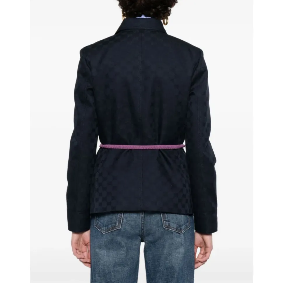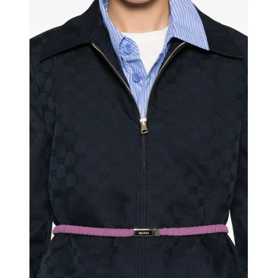 Gucci GG Cotton Gabardine Zip Jacket kombinerer den karakteristiske GG gabardine tekstur med en ren lynlåslukning foran og et aftageligt bælte, der giver alsidig og elegant lagdeling. Vigtige egenskaber: Blå | Bomuldsgabardine | Aftageligt bælte | Lynlåslukning foran | Foret | Spids krave | Lange ærmer | GG gabardine mønster | Mål & pasform: Længde: 59,9 cm baseret på en størrelse 40 (IT) | Sammensætning & pleje: Materiale: 55% Polyester, 45% Bomuld | Bælte: 53% Acetat, 47% Viskose | Foring: 100% Viskose