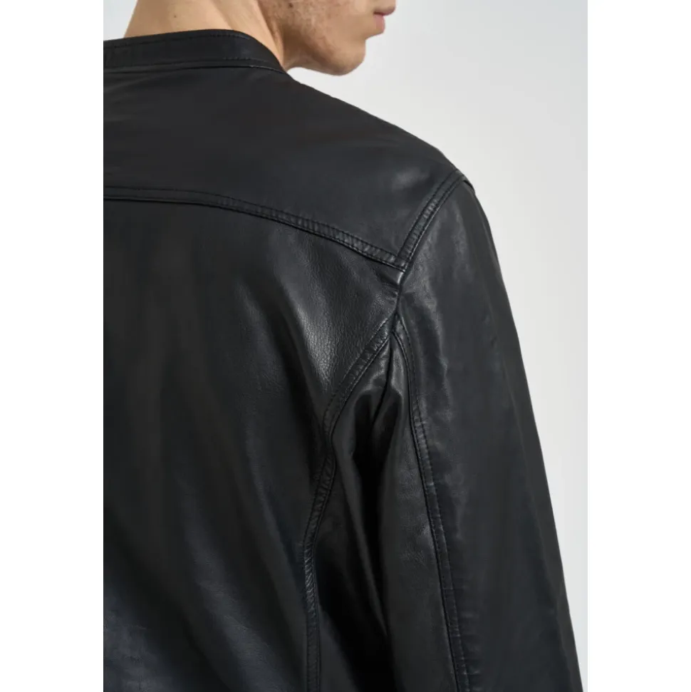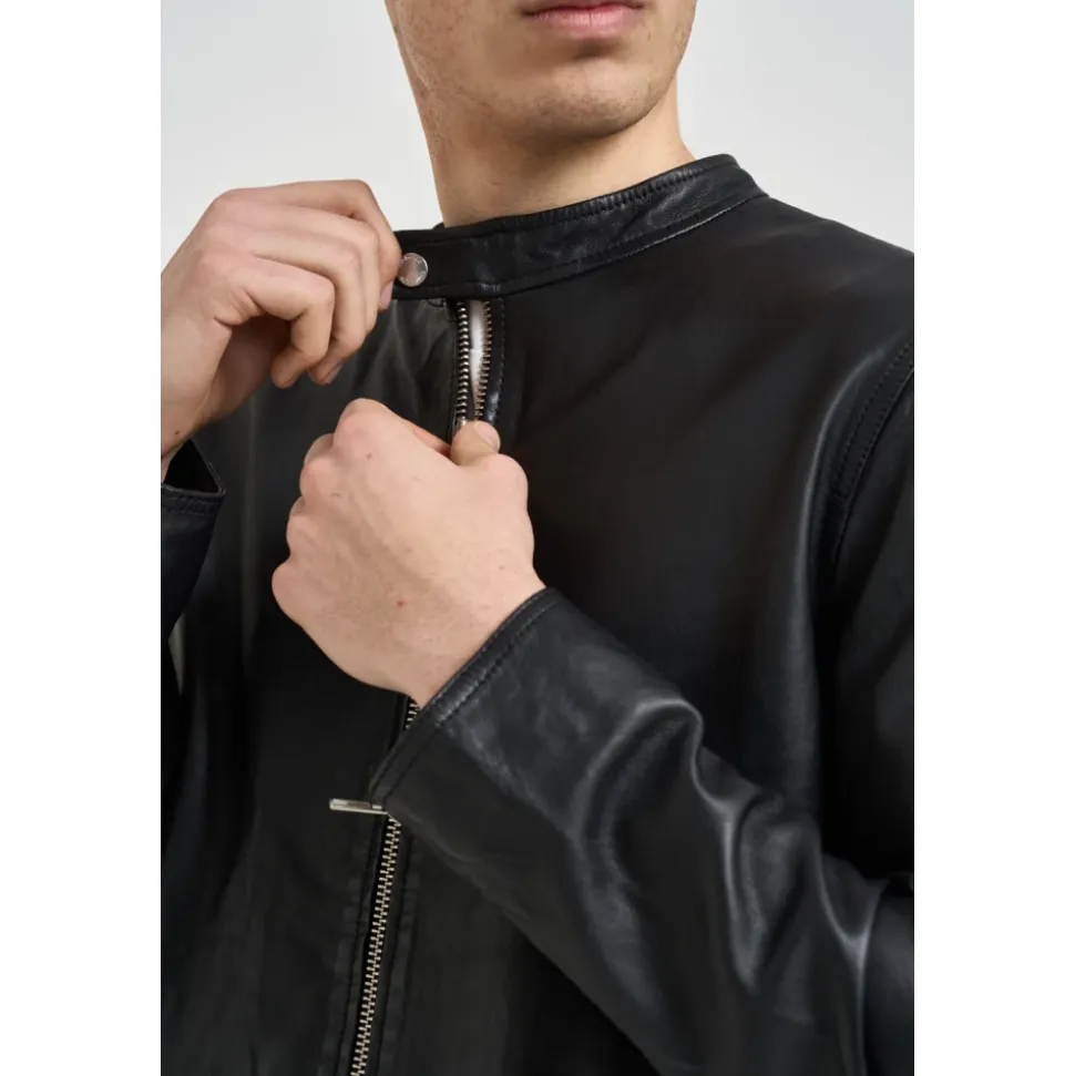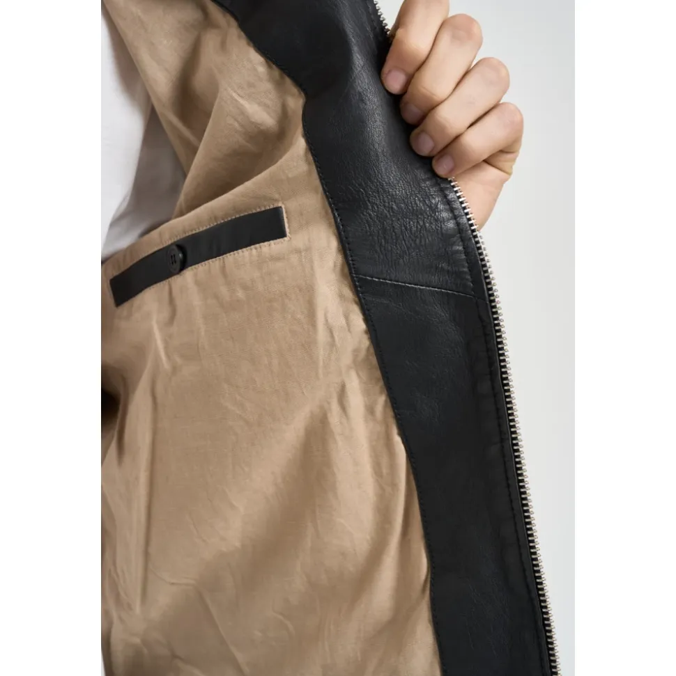 BomBoogie Giubbotto in pelle er en klassisk læderjakke med foret interiør og central lynlås, bygget til alsidig hverdagsbrug. Vigtigste egenskaber: Sort | Læder | Foret interiør | Central lynlåslukning | Eksterne lynlåslommer med lynlåse | Indvendige lommer | Lynlåse isat ved ærmekant (manchetlynlåse) | Mål & pasform: Modelhøjde: 190 cm; iført størrelse L | Sammensætning & pleje: Ydermateriale: 100% læder | Foring: 55% hør, 45% bomuld