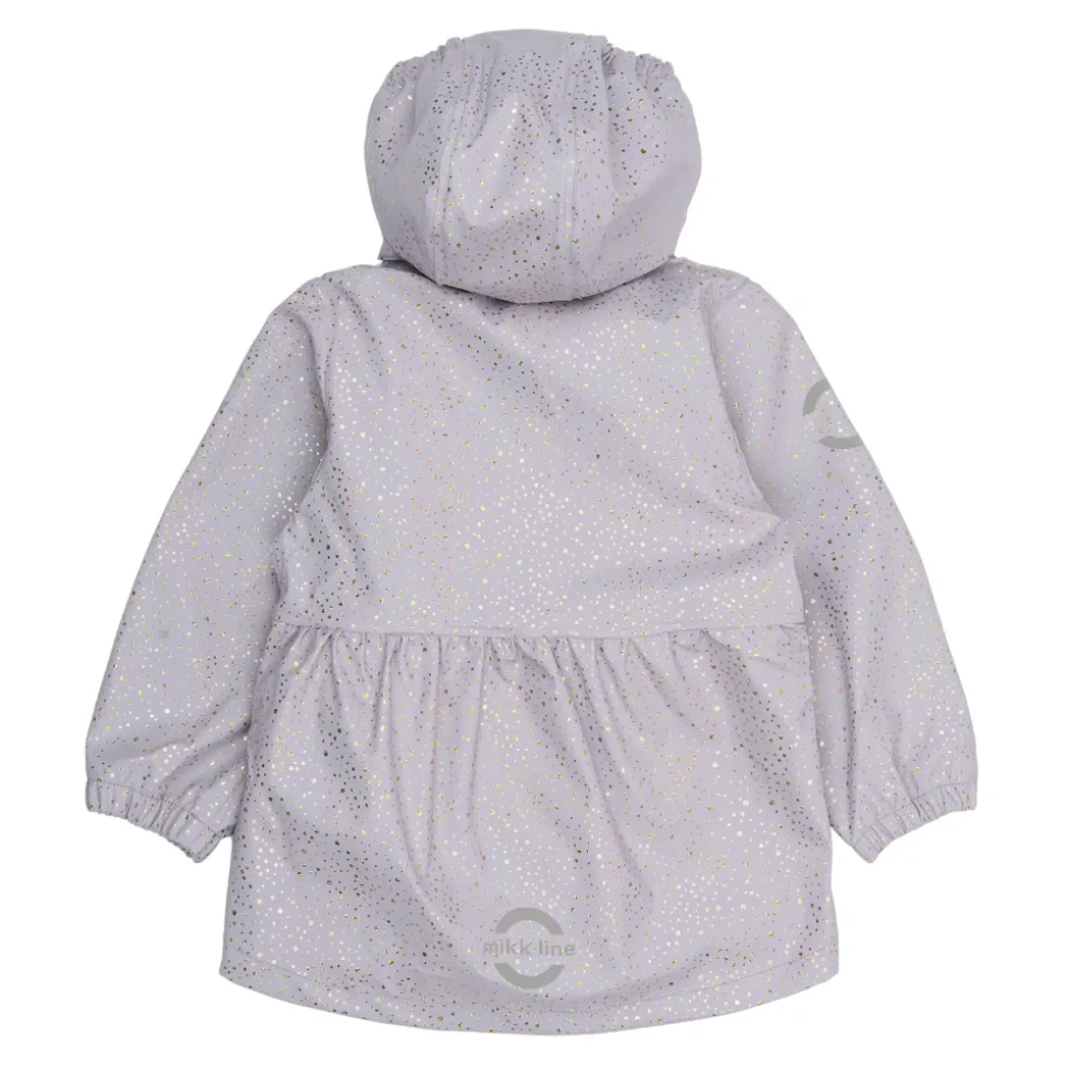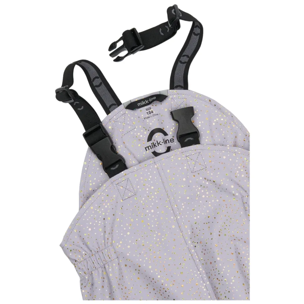 Mikk-Line – PU Glitter Rain Set, 3341 – Lavender Aura Skønt regnsæt til pigerne fra Mikk-Line. Dette i en flot lys lilla farve med multifarvet glimmer prikker over det hele.Sættet består af jakke samt bukser.Regnjakken har en gennemgående lynlås samt knapper foran.Jakken har et feminint snit og lidt ekstra længde bagpå end foran.Der er aftagelig hætte, som sider fast med knapper. Der er elastik kanter omkring håndleddene samt i åbningen på hætten.På begge ærmer samt nederst på ryggen er der en refleks, så barnet lettere bliver set i de mørke timer.Regnbukserne er med seler til og med str. 104 – fra str. 110 er der elastik i livet.Der er elastik kanter omkring anklerne, så buksebenene ikke glider ned over fødderne.Der er elastikstropper under fødderne, som kan sættes under gummistøvlerne, så regnbukserne ikke glider op ved f.eks. leg.Nederst på venstre ben er der to striber refleks, for god synlighed. Materiale: Ydre: 100% polyurethanForing: 100% polyester Rart at vide:Vandtæt (WP): 5.000 mmVindtætSvejsede sømmeSeler til og med str. 110Reflekser på jakke og buks; Reflekserne er godkendt i henhold til EN 471 standard og er synlige i en afstand på op til 140 meter Vask: 30 grader skånevaskHusk at følge vaske- og brugsanvisningStyle no.: 3341_Lavender Aura