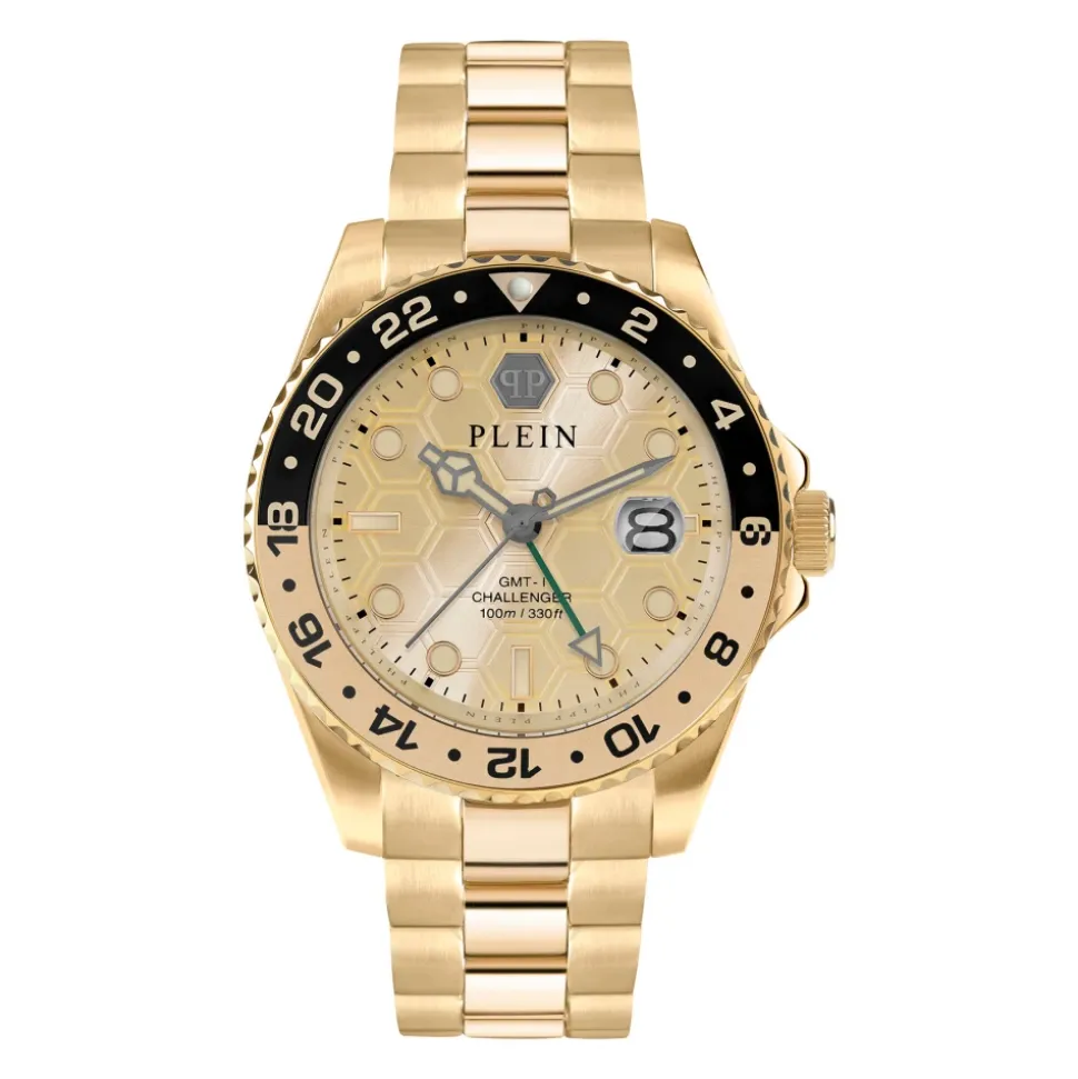 Philipp Plein GMT-I CHALLENGER 44MM – IP GULDFARVET URKASSE – GULDFARVET SKIVE – IP GULDFARVET ARMBÅND. Vær modig med dette luksuriøse herreur med en 44 mm guldfarvet rustfri stålkasse, 10 ATM vandtæthed og leveres i en Philipp Plein dødningehoved gaveæske.