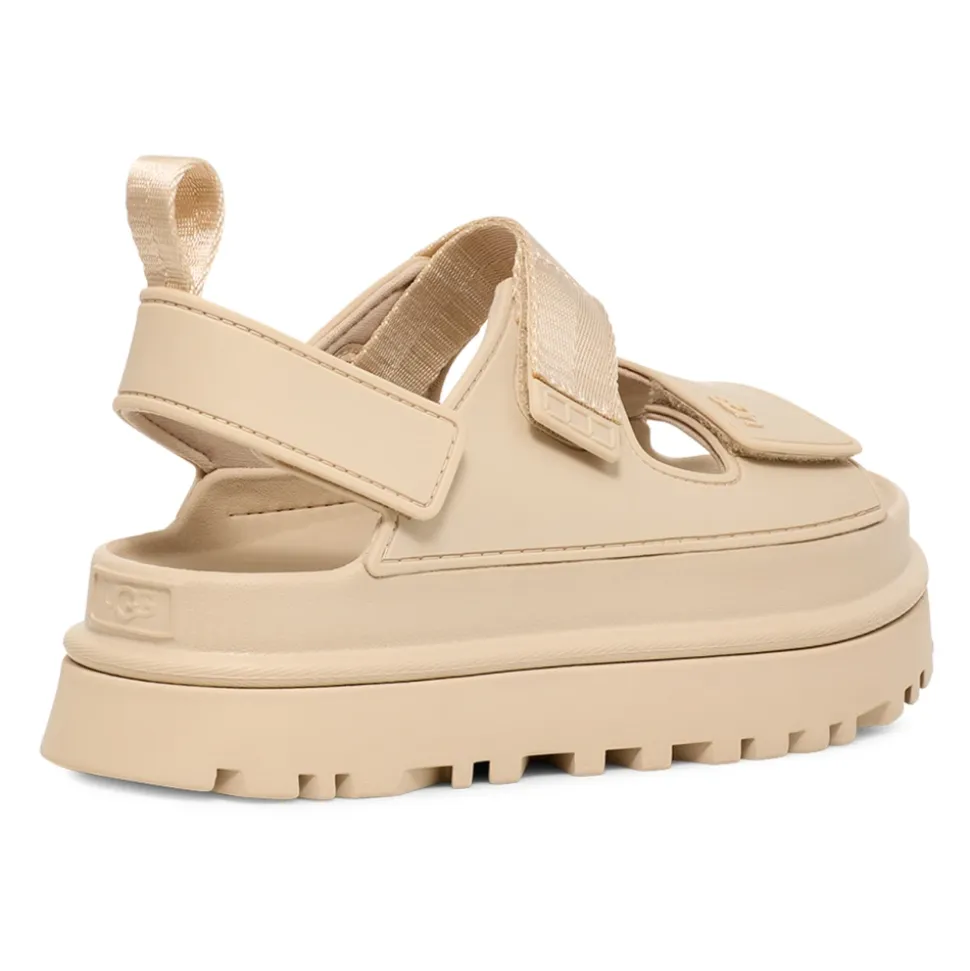 UGG GoldenGlow Sandal er en let, vandvenlig platformsandal, der kombinerer justerbar støtte med en skridsikker, formstøbt fodseng til hverdagsbrug. Nøgleattributter: Beige | Havsalt | TPU og sukkerrørs-EVA | Vandvenlig | Let | Skridsikker sål | Justerbare burrebånd | Trækflig bagpå | Platform med rillet sål | Design med tå- og slingbackrem | Formstøbt fodseng | Mål og pasform: Normal i størrelsen | Sammensætning og pleje: TPU-overdel | Sukkerrørs-EVA mellemsål | Sukkerrørs-EVA ydersål | Tekstilfor | Polyestertrækflig og webbing