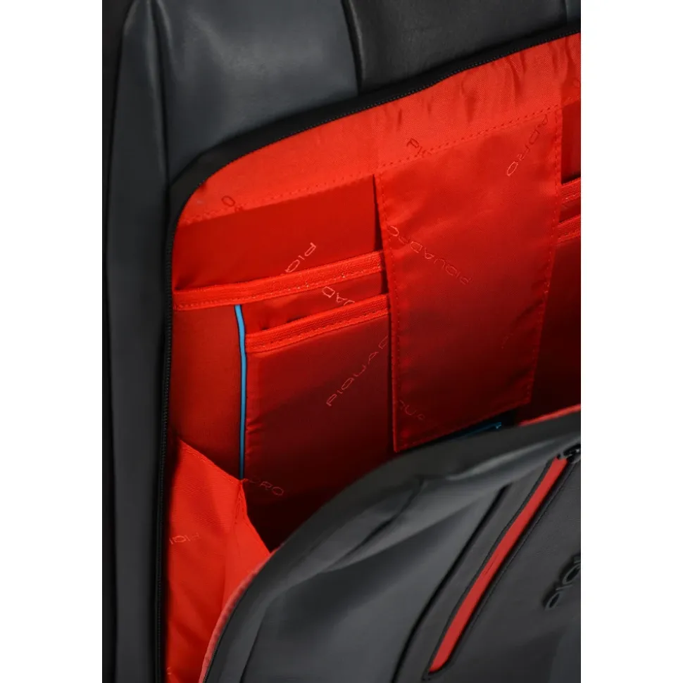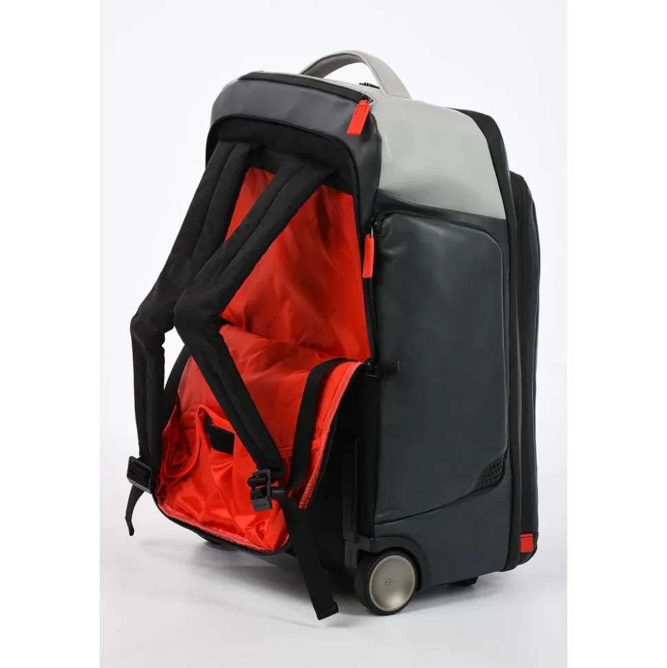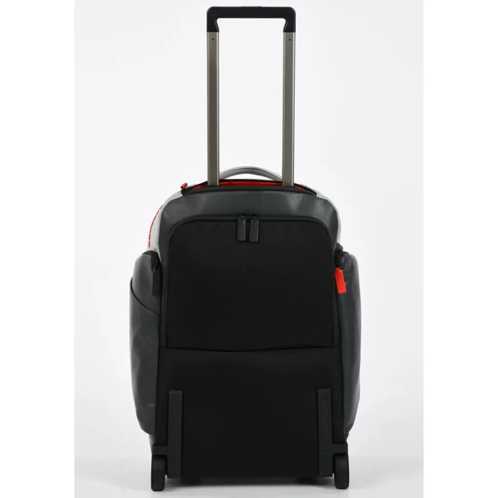 Opdag Piquadro Cabin Bag til mænd, lavet i fin læder. Vejer kun 2,9 kg, med dimensioner på 35,00 x 53,50 x 25,00 cm, denne halvstive taske har en USB- og micro-USB-plade, vertikale konstruktionsdetaljer, trolley-system med to stænger, fast skulderrem og et polstret rum til en 15,6″ notebook.
