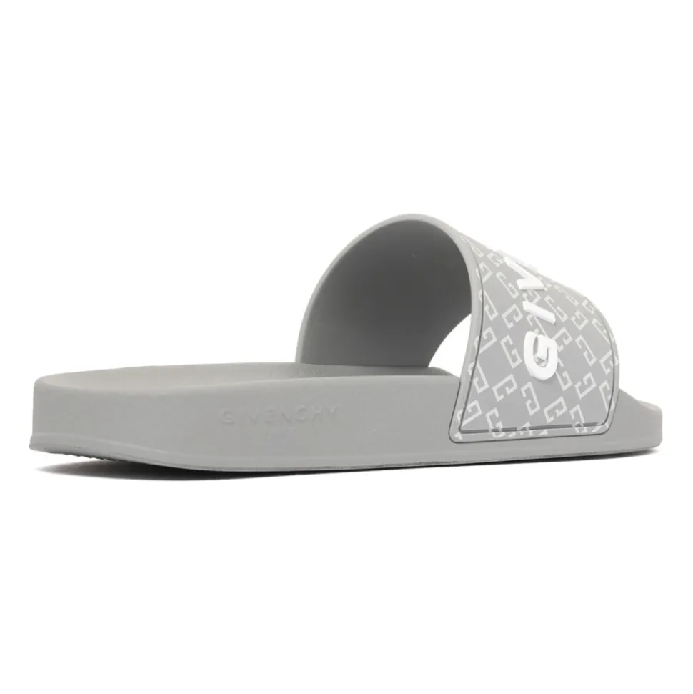 Forhøj din afslappede stil med disse Givenchy Grey Slides. Lavet af grå polyurethan med mat finish, disse slip-on sliders har et præget logo på forsiden, monogrammotiv, åben rund tå, formet indersål og flad gummisål.