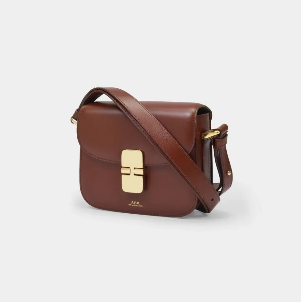 Forøg din stil med denne A.P.C. ‘Grace Mini’ skuldertaske i glat brun læder. Designet til den moderne kvinde, denne trapezformede taske har en klaplukning, justerbar skulderrem og flere rum til dine essentielle ting. Lavet af 100% koskind med guldfarvet hardware, er denne kompakte taske et elegant tilbehør til din garderobe.