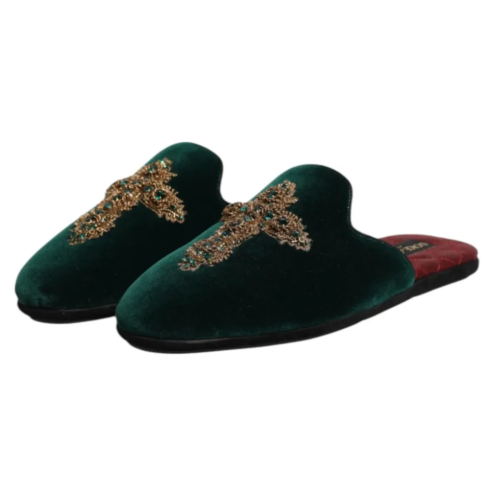 Grøn Velvet Cross Embellished Slippers