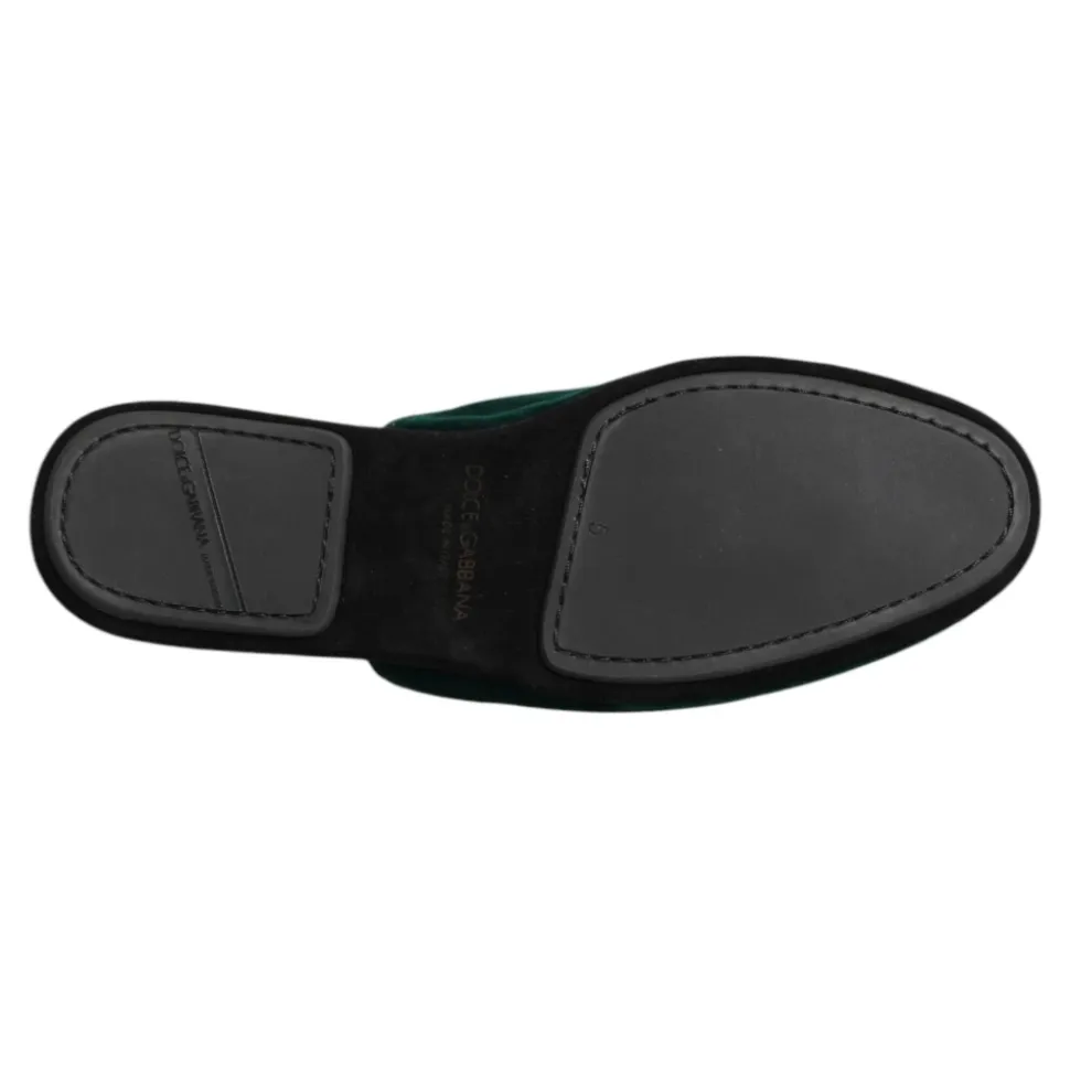 Forkæl dig selv med disse luksuriøse Dolce & Gabbana grønne fløjlsslides. Fremstillet i Italien med materialer af høj kvalitet, disse slip-on sandaler har en glat rød satin indersål og lædersål. En perfekt kombination af eksklusivitet og håndværk.