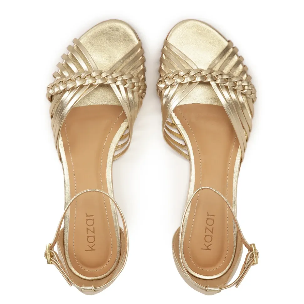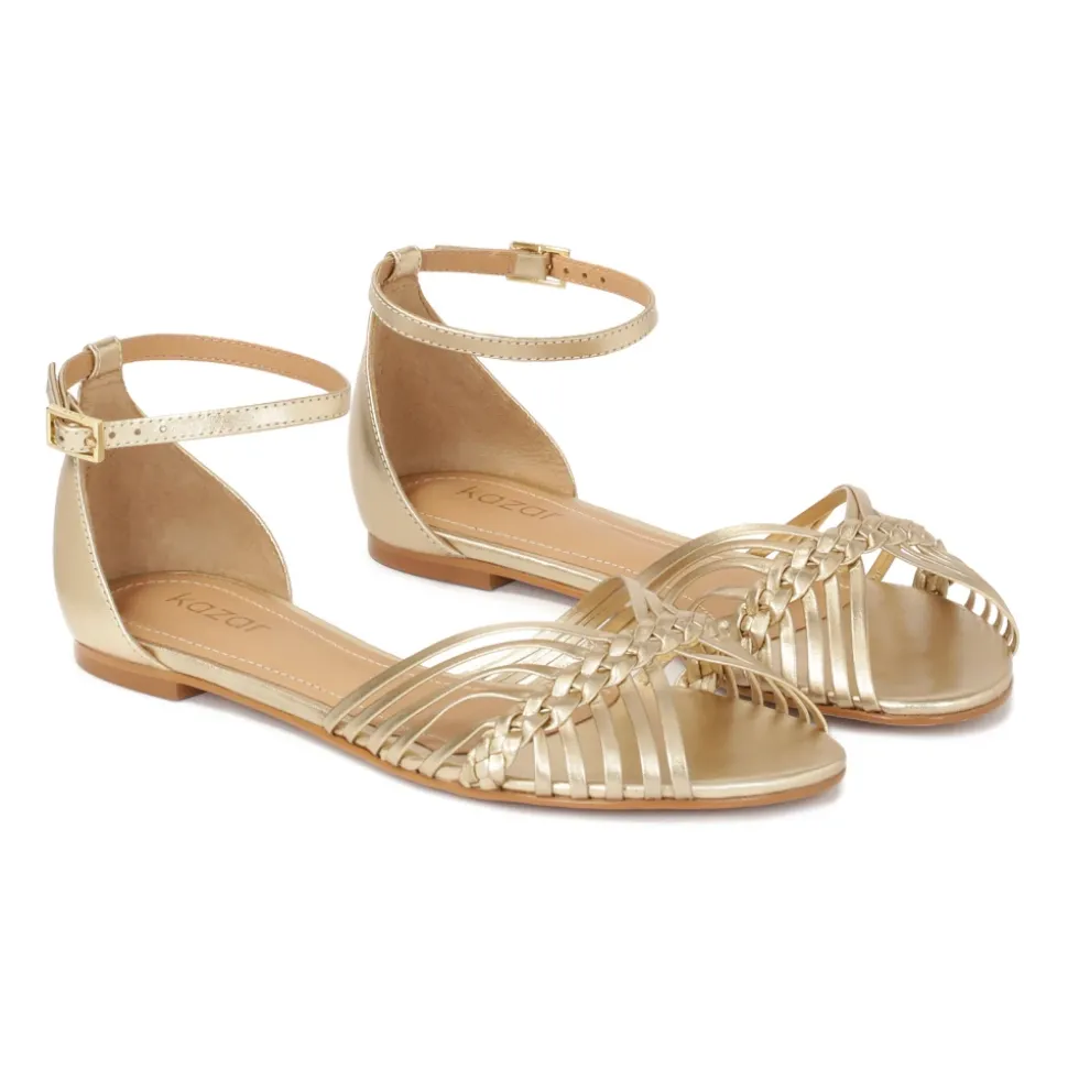 Flade sandaler i guld farvet naturlæder er en unik model, der kombinerer komfort med elegance og finesse. Den indbyggede hæl giver stabilitet og en behagelig pasform, og den delikate rem om anklen svøber den subtilt og tilføjer et chic touch. Forsiden af sandalerne er dekoreret med en sammensætning af talrige tynde remme, der harmonisk er forbundet af en flettet fletning, der skaber et subtilt, men luksuriøst touch. Ideel til varme dage tilføjer sandalerne et sofistikeret touch til både hverdags- og mere elegante outfits. Den tunge lædersål er kendetegnet ved sin holdbarhed og æstetiske appel. Foret lavet af semianilin-fåreskind giver enestående komfort takket være dets fremragende fugtabsorberende egenskaber.