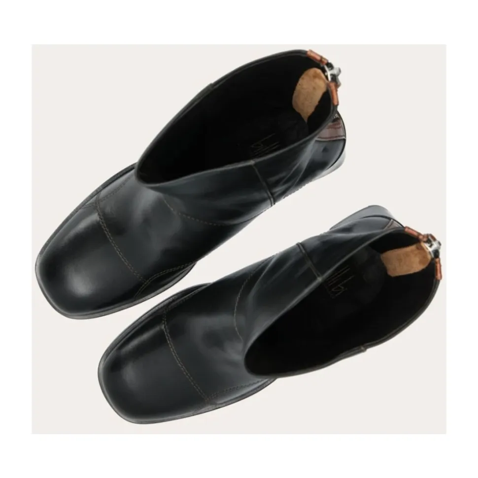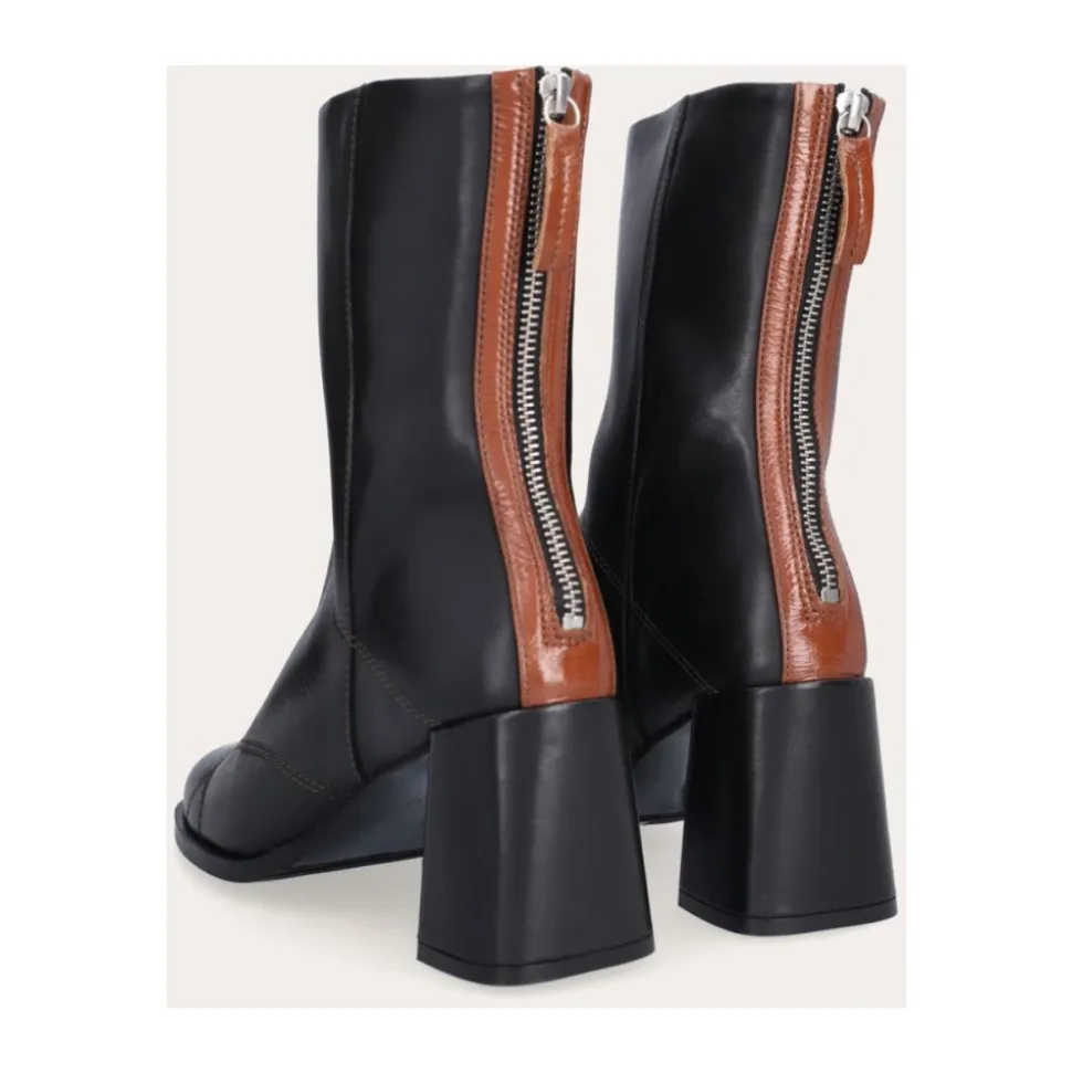 Håndlavede hælstøvler fra Billi Bi, udført i glat sort læder med en firkantet tå. Dekoreret med korssting foran og med et tyndt stykke brunt læder på hver side af lynlåsen bagpå. Støvlerne har en høj blokhæl.