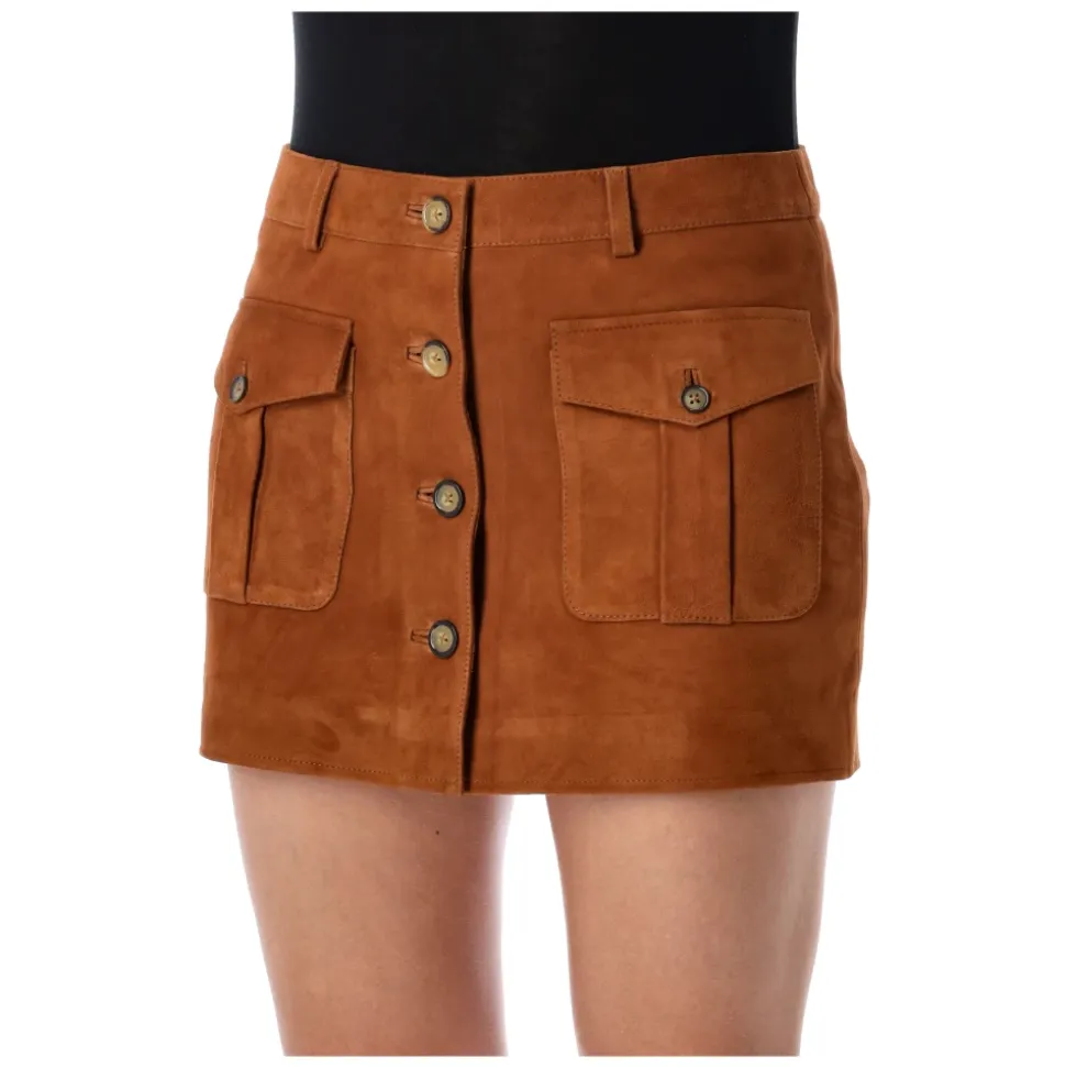 Forkæl dig selv med denne hasselnødde mini nederdel fra The Garment, lavet af blød gedeskindssuede. Med en dekorativ knap række, to store lommer og bæltestropper til alsidig styling. Modellen er 1,75 m og bruger størrelse 8.