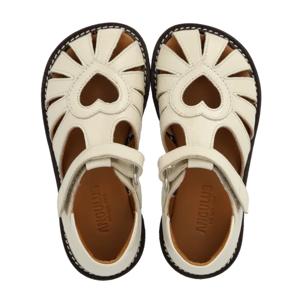 Angulus – Hjerte Sandal Med Velcro, 5186 – Buttermilk PT Rigtig sød sandal i lak med velcro fra Angulus.Denne i en flot råhvid farve i lak (læder) med et sødt hjerte-hul på foden og mørkebrun rågummisål.Sandalen har justerbar velcrorem, lukket tå, vatteret indersål, kromfrit læderfoer, en fast hælkappe med præget logo og polstret krave for ekstra komfort og støtte og en let, blød og fleksibel mørkebrun rågummisål i fornybart naturgummi udskåret med fokus på svangstøtte. Udformet i naturligt og åndbart patenteret læder. Designet i Danmark og håndlavet med kærlighed i Portugal. Vi anbefaler 1,3-1,5 cm voksetillæg. Pasform: Læst: Normal til bred pasform / NAT/S Materiale: Materiale: Patenteret skindFoer: Kromfrit skindfoerSål: FSC-certificeret rågummisål Style no.: 5186-103-3285 Indvendige mål:Str. 26: 17,0 cmStr. 27: 17,7 cmStr. 28: 18,5 cmStr. 29: 19,1 cmStr. 30: 19,8 cm Mål er vejledende og kan afvige med 1-2 milimeter.