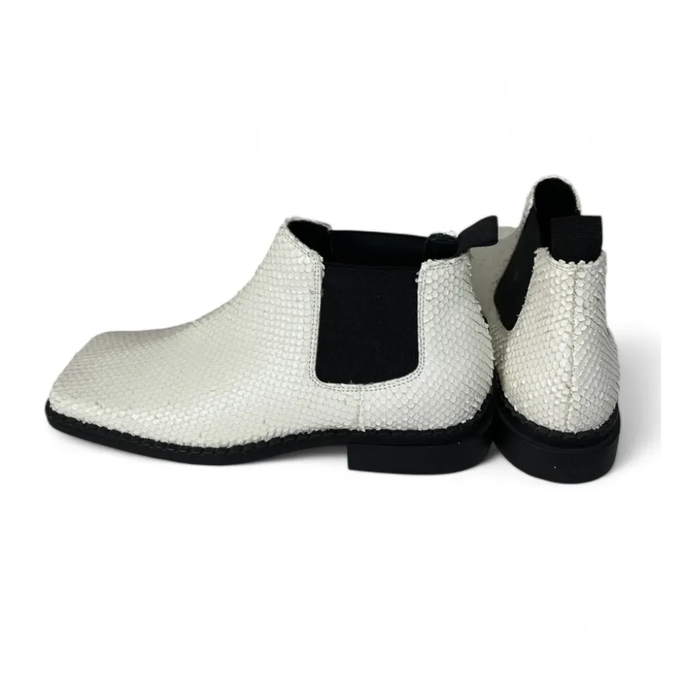 Løft din stil med disse VIC MATIE Chelsea-støvler. Fremstillet af 100% perforeret læder i et fantastisk reptilmønster, har disse hvide støvler en træktab ved skaftet, sideelastiske indsatser, en firkantet tå og en blokhæl i et lagdelt trælook. Komplet med en skridsikker sål for ekstra trækkraft.