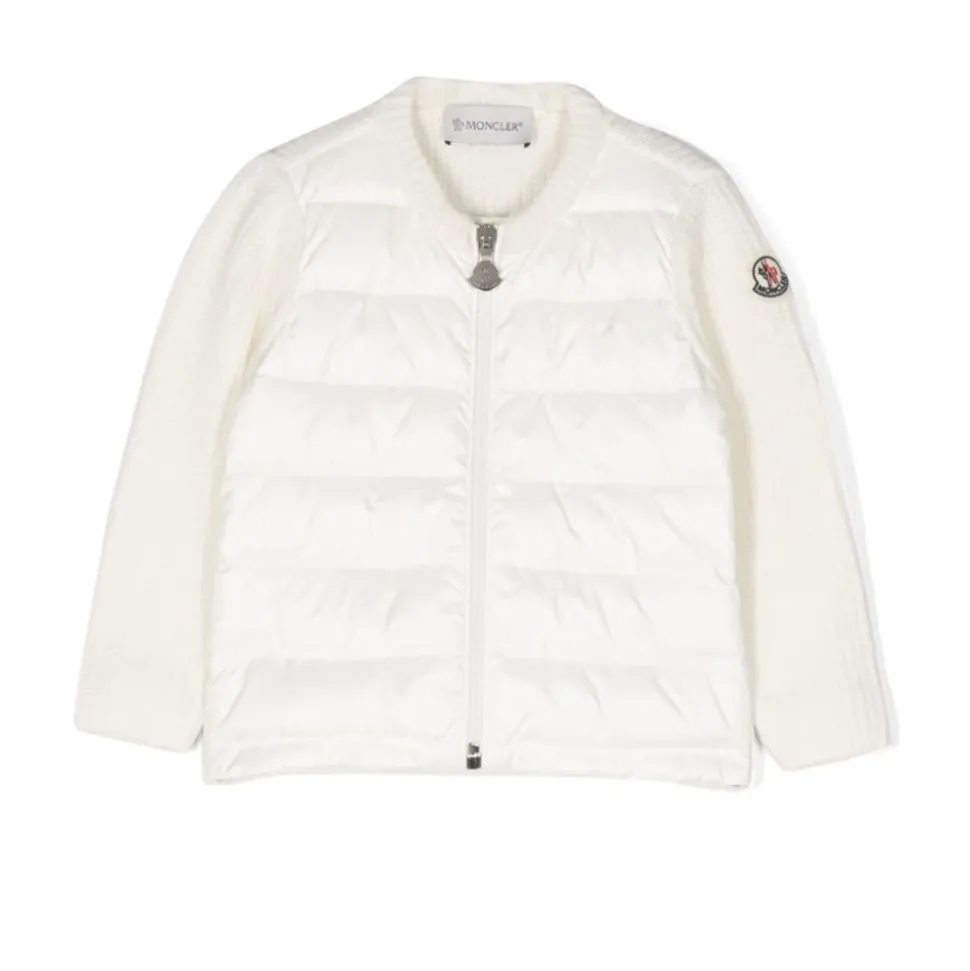 Hold dig varm og stilfuld med Monclers hvide sweater til børn, der har et quiltet nylonpanel foran, fyldt med dun for ekstra varme. Denne elegante cardigan er perfekt til at tilføje et strejf af sofistikering til ethvert vinteroutfit. Produkt detaljer: Hvid | Jomfruuld | Bomuld | Polyamid | Ekstra varme | Lynlåslukning foran | Quiltet nylonfront | Logo-patch på ærmet | Dimensioner og pasform: Normal pasform | Sammensætning og pleje: Jomfruuld | Bomuld | Polyamid | Renseri anbefales