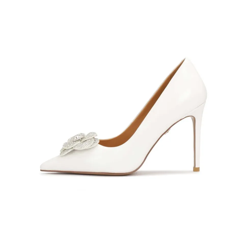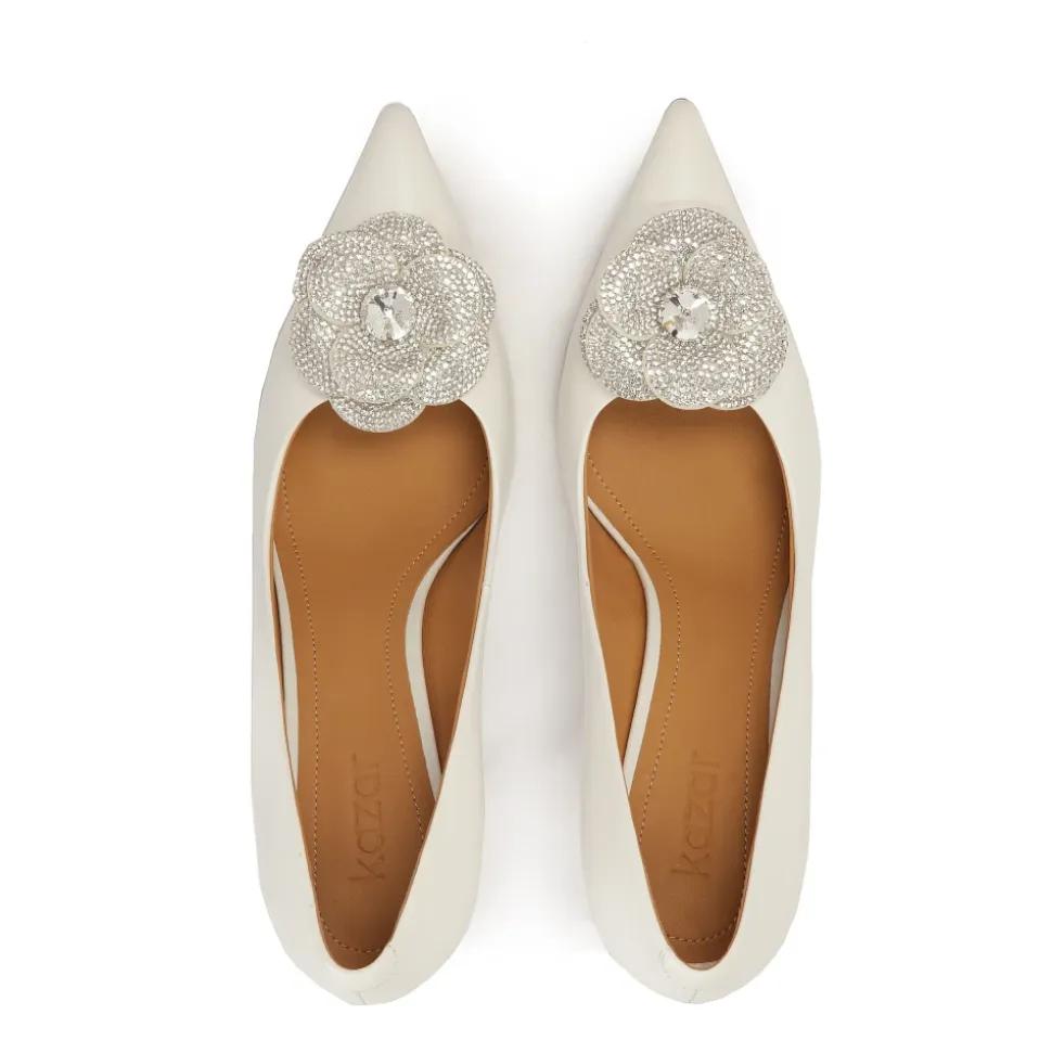 Hvide bryllupspumper er karakteriseret ved elegance og sofistikering, der passer perfekt til den unikke atmosfære på denne særlige dag. Lavet af topkvalitets naturligt læder, tilbyder de både komfort og stil. Pumperne har en slank hæl, der tilføjer lethed til silhuetten og forlænger benene, samtidig med at de giver stabilitet og komfort. Det karakteristiske element af dette fodtøj er de store, glitrende blomster, der pryder den spidse tå. Disse blomster er en romantisk og luksuriøs accent, der passer perfekt til en elegant brudekjole. Sålen lavet af tunisk læder er karakteriseret ved sin holdbarhed og æstetiske udseende. Den er dekoreret med et metalmonogram med en krystal og en smuk sætning. Skoens indersål er polstret med semianilin-fåreskind, der takket være dets fremragende fugtabsorberende egenskaber giver enestående komfort.