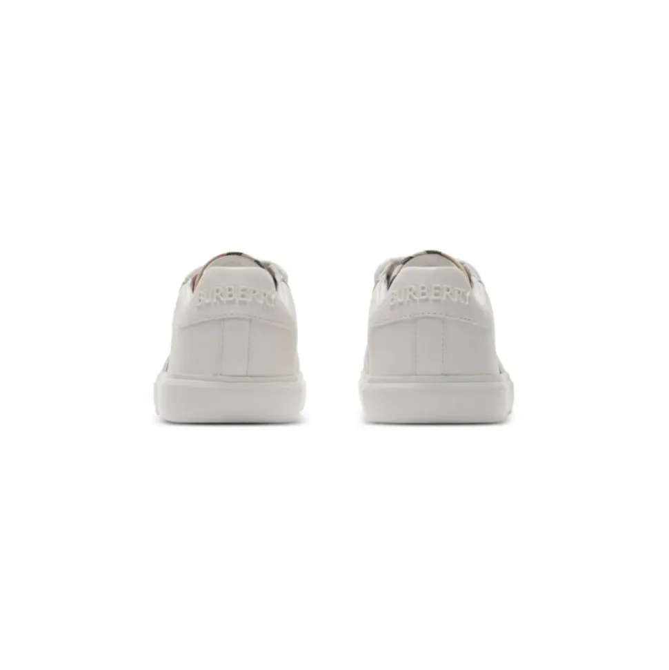 Oplev den klassiske elegance ved Burberrys hvide sneakers med snørebånd, designet med en elegant gummisål og fremstillet af førsteklasses læder for hverdags komfort og stil. Produkt detaljer: Hvid | Læder | Snørelukning | Hævet Burberry-skrift ved hælen | Sammensætning og pleje: 100% Læder | Aftørres med en fugtig klud.