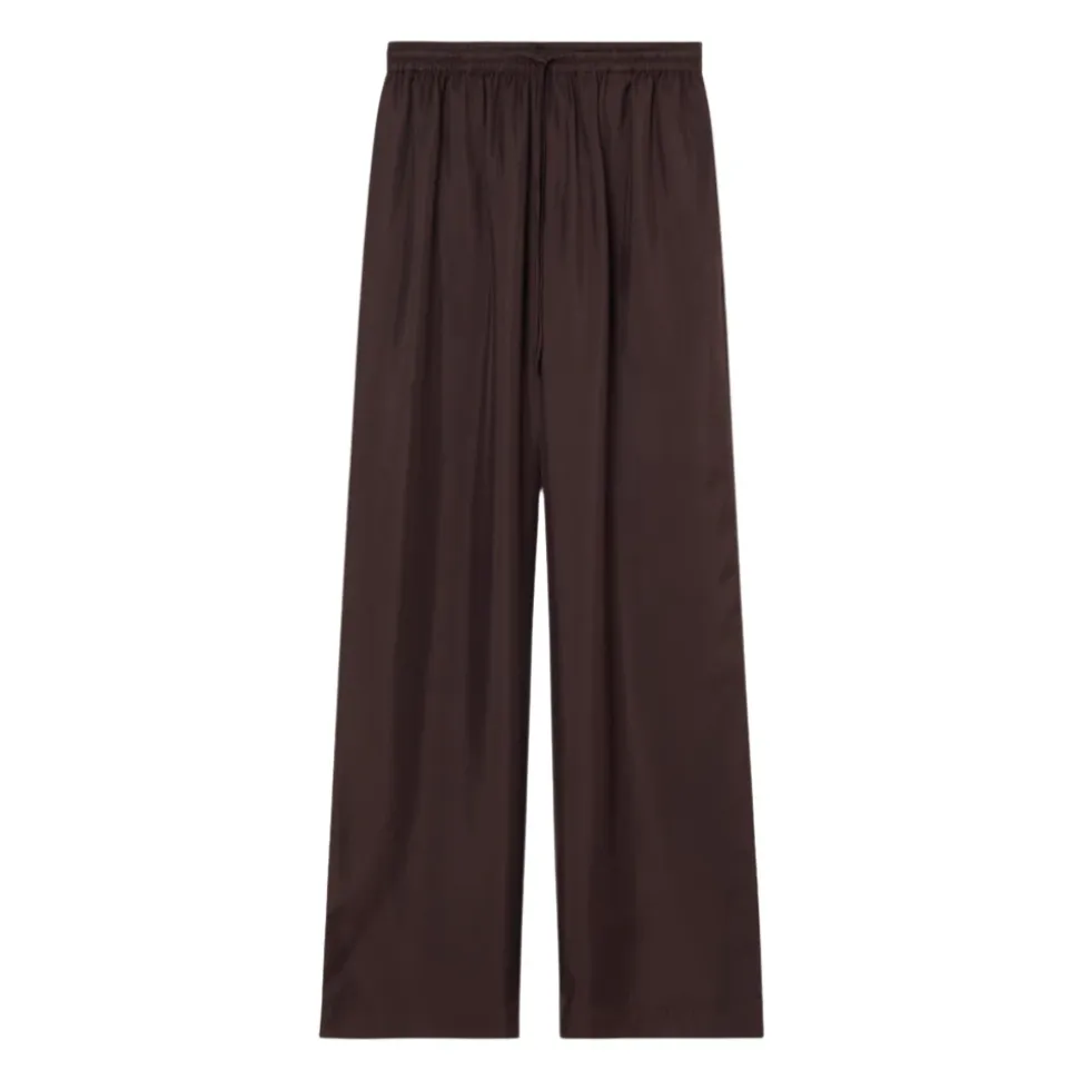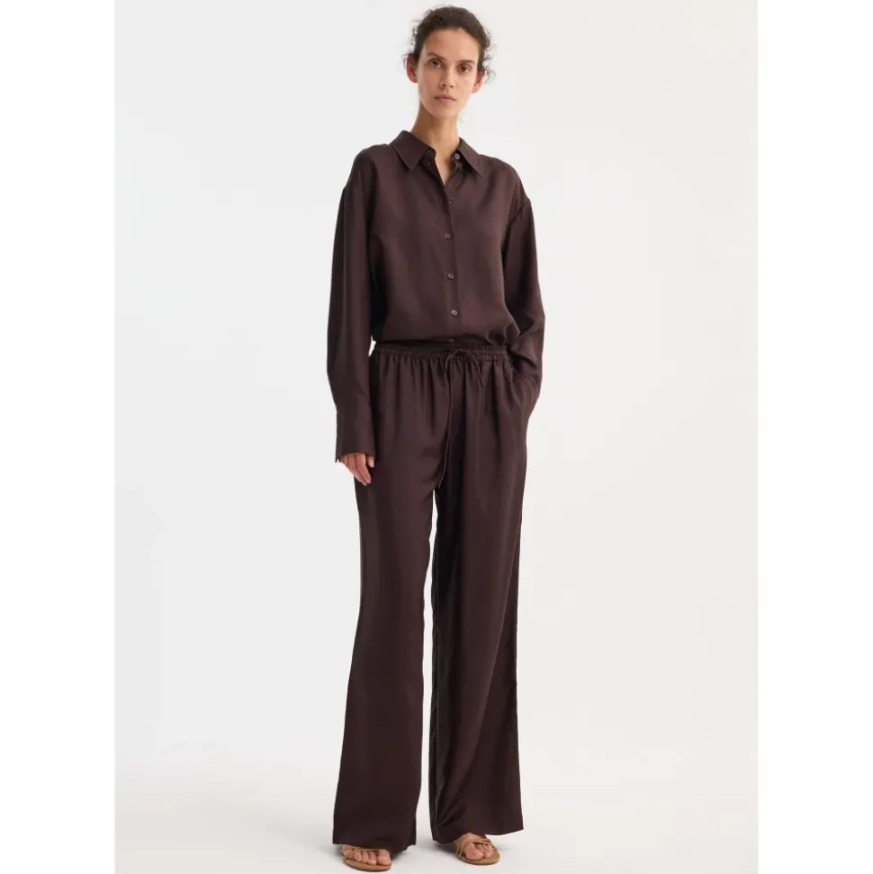 Róhe HW25 Wide Silkebukser kombinerer tidløs komfort med luksuriøs, let silke, perfekt til afslappede hverdagslooks eller raffinerede outfits. Vigtige egenskaber: Brun | Mahogni | Silke | Elastisk taljebånd med snøre | Bredt ben | Twill struktur | Blød glans | Dimensioner og pasform: Bred pasform | Flydende drapering | Sammensætning og pleje: 100% silke