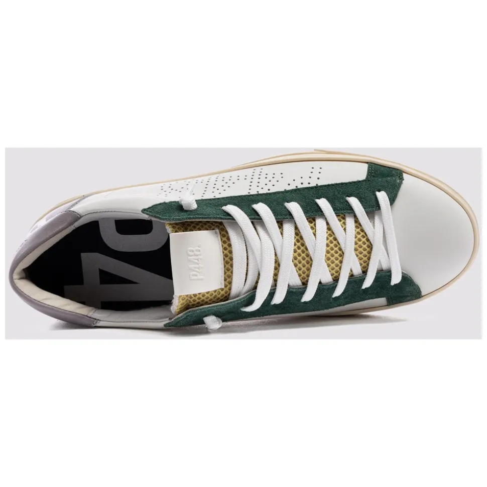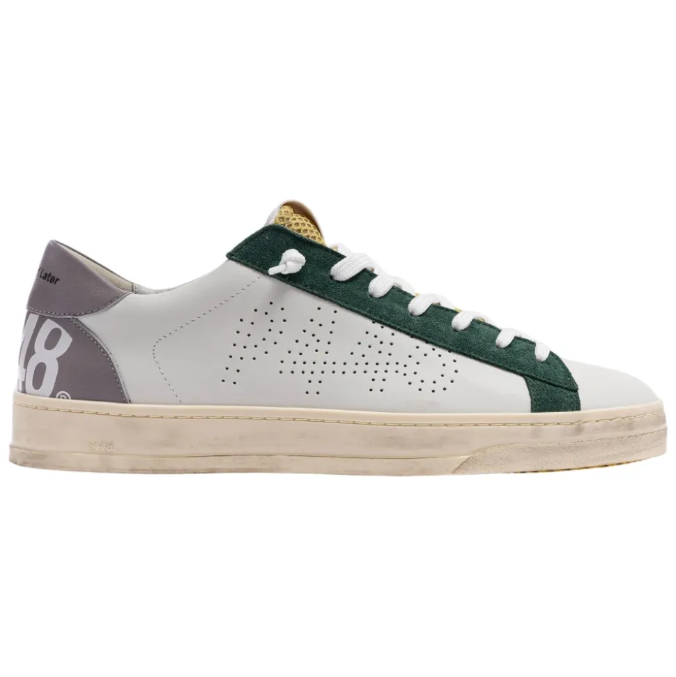 P448 Jack White Forrest sneakers kombinerer en klassisk, lav silhuet med flerfarvede detaljer til hverdagsbrug. Designet skiller sig ud med sin gule mesh-pløs, mørkegrøn ruskindskant og hånd-distressed gummisål. Vigtigste egenskaber: Flerfarvet | Grøn | Læder | Memory foam indersål | Hånd-distressed gummisål | Ekstra par snørebånd inkluderet | Frottéfor | Gul mesh-pløs | Mørkegrøn ruskindskant | Grå tekstureret læderhælstrop | Perforeret P448 logo | Orange slidbane | Dimensioner og pasform: Normal i størrelsen | Sammensætning og pleje: Læderoverdel | Mesh-pløs | Ruskindskant | Teksturerede læderdetaljer | Frottéfor | Memory foam indersål | Gummisål | Polyester snørebånd | Tørres af med en fugtig klud. Må ikke tørres i direkte sollys eller høj varme. Behandl læder med en beskyttende spray før brug og pleje det periodisk. Lad skoene tørre helt, før de tages i brug.