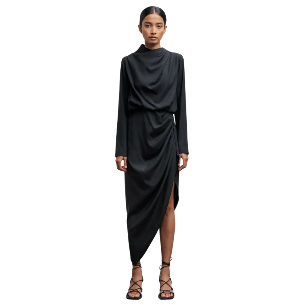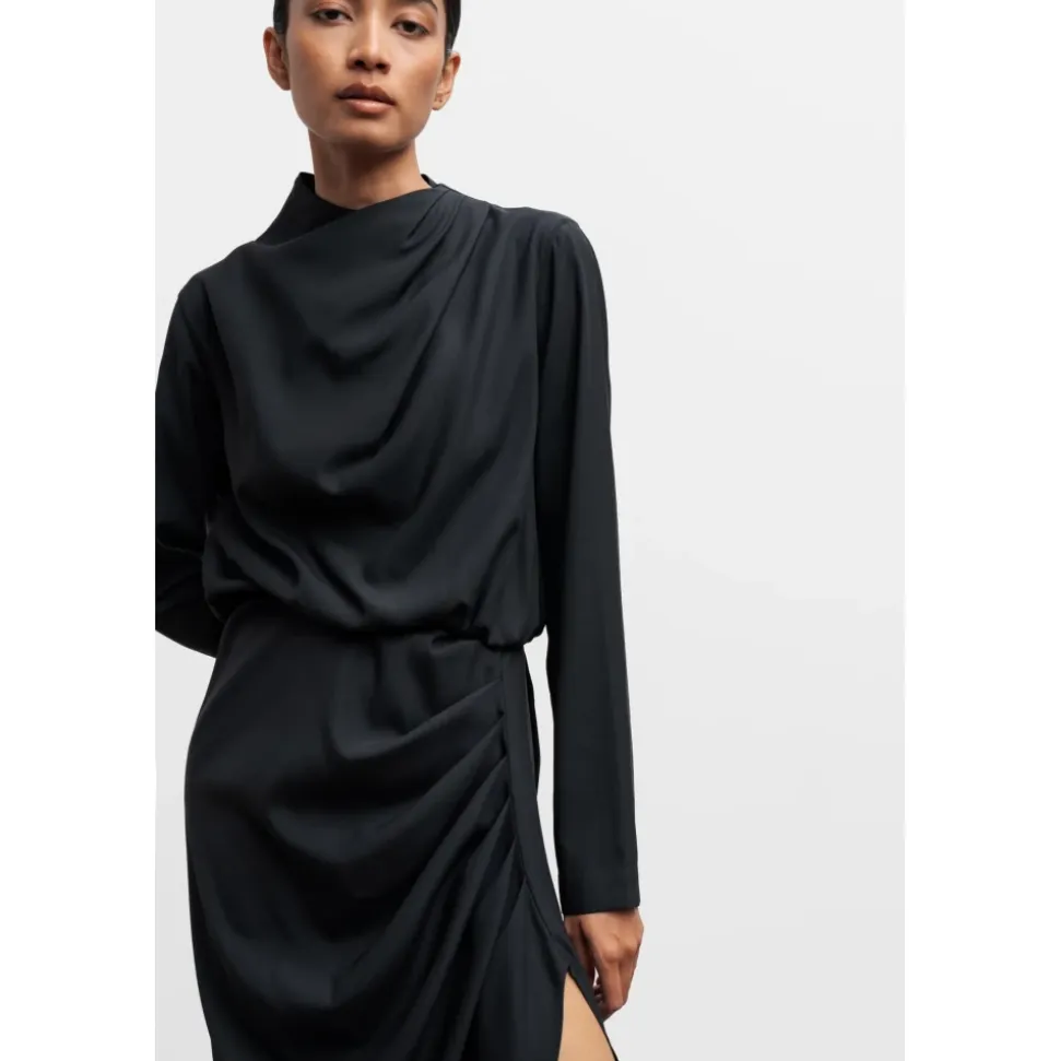 Jade kjolen er lavet af en acetat/stræk blanding med en crepe de chine overflade og har asymmetriske folder til drapering langs halsudskæringen sammen med lange og smalle ærmer. Der er en elastik omkring taljen og en usynlig lynlås i nakken bagpå, og nederdelen indeholder en høj slids og placerede folder til drapering. Den perfekte kjole til sene aftenfester. • Pasform: Normal i størrelsen, tag din normale størrelse. Sumaya er 171 cm høj og bruger størrelse S. • Kvalitet: 65% acetat, 31% polyester, 4% spandex • Vedligeholdelsesinstruktioner: Håndvask. Må ikke tørretumbles. Stryg ved lav varme. • Vidste du, at du kan afhente din ordre gratis i vores showroom, Rådmansgatan 35, i Stockholm? Vi sender dig en e-mail, når den er klar, typisk inden for 24 timer.