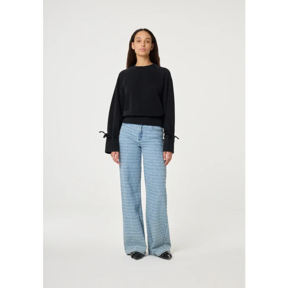 This black sweater is made from 100% cotton, offering comfort and a pleasant wearing feel. At the cuffs, it has the option to cinch the sweater tighter and is decorated with playful bows. Pair it as you wish for any occasion, whether casual or a bit more elegant.