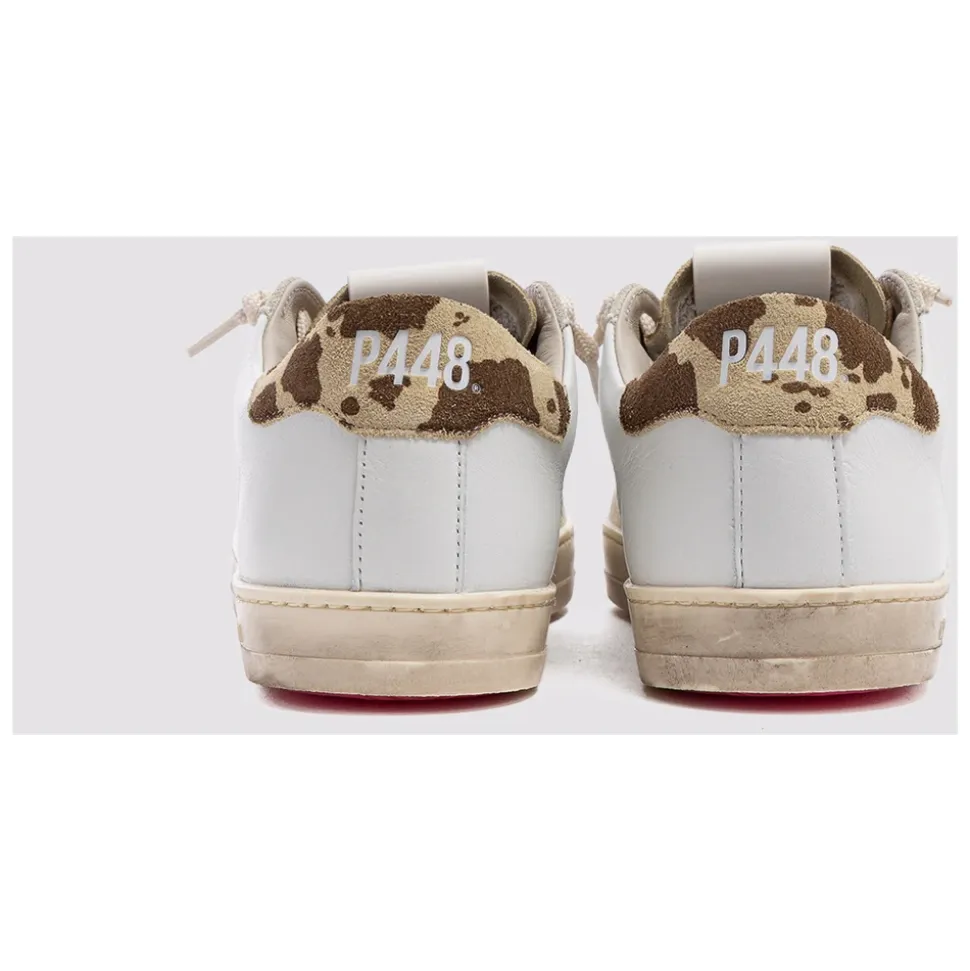 P448 John Sneaker kombinerer klassisk lavtop-stil med iøjnefaldende ko-print detaljer og en hånddistressed gummisål til hverdagsbrug med personlighed. Nøgleattributter: Multicolor | Hvid | Læder | Ruskind | Polstret memory-foam indersål | Gummisål med skridsikkert mønster | Inkluderer ekstra par lyserøde snørebånd | Ko-printet beige læder pløs og hælstrop | Perforeret P448 logo | Creme snørebånd med ekstra lyserøde snørebånd som mulighed | Signatur P448 hånddistressed gummisål med lyserøde slidbaner | Sammensætning & pleje: Læder | Ruskind | Frottéfor | Memory-foam indersål | Gummisål | Polyester snørebånd