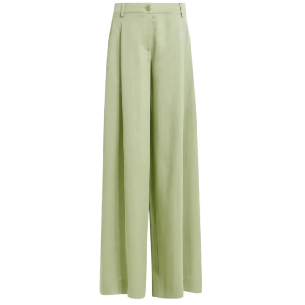 Essentiel Antwerp JUSTICIA Trousers er højtaljede bukser med brede ben, der tilbyder en afslappet, skræddersyet silhuet. De skiller sig ud med deres pressede plissering og rene finish, der er velegnet til både arbejde og et mere elegant, afslappet look. Nøgleattributter: Lysegrøn | Lyocell | Mellemvægtigt, ikke-strækbart stof | Lynlås- og knaplukning | Skrå forlommer | Paspoleret baglomme | Bæltestropper | Pressede plisseringer i taljen | Skræddersyet finish | Dimensioner og pasform: Størrelse 36 — Indvendig benlængde: 85,5 cm | Størrelse 36 — Talje: 75 cm | Afslappet pasform | Høj talje | Brede ben | Sammensætning og pleje: 100% Lyocell | Maskinvask ved 30°C. Må ikke tørretumbles. Stryg ved lav temperatur.