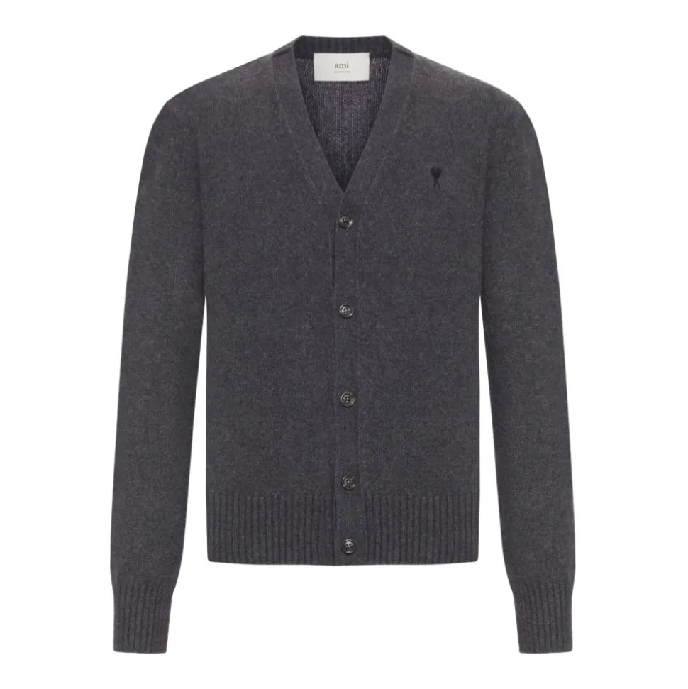 Forkæl dig selv med denne Ami Paris kulgrå cashmere V-hals cardigan til mænd. Med knaplukning, ribstrikket kant og logo detalje.