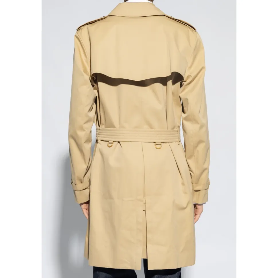 Kensington Mid trenchcoaten fra Burberry er en tidløs klassiker fremstillet i vandafvisende bomuldsgabardine. Dette dobbeltradede design er perfekt til dem, der søger både stil og funktionalitet. Produkt detaljer: Beige | Bomuldsgabardine | Vandafvisende | Bælte i taljen | Krave med hægtelukning | Justerbare stropper ved manchetterne | Dobbeltradet | Epauletter | Stormflap | Knaplommer med flap | Signatur ternet foring | Dimensioner og pasform: Regular fit | Sammensætning og pleje: 100% Bomuld | Renseri anbefales