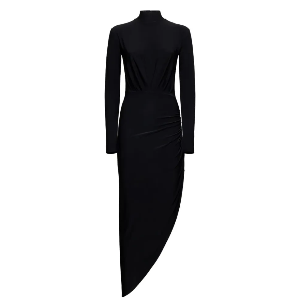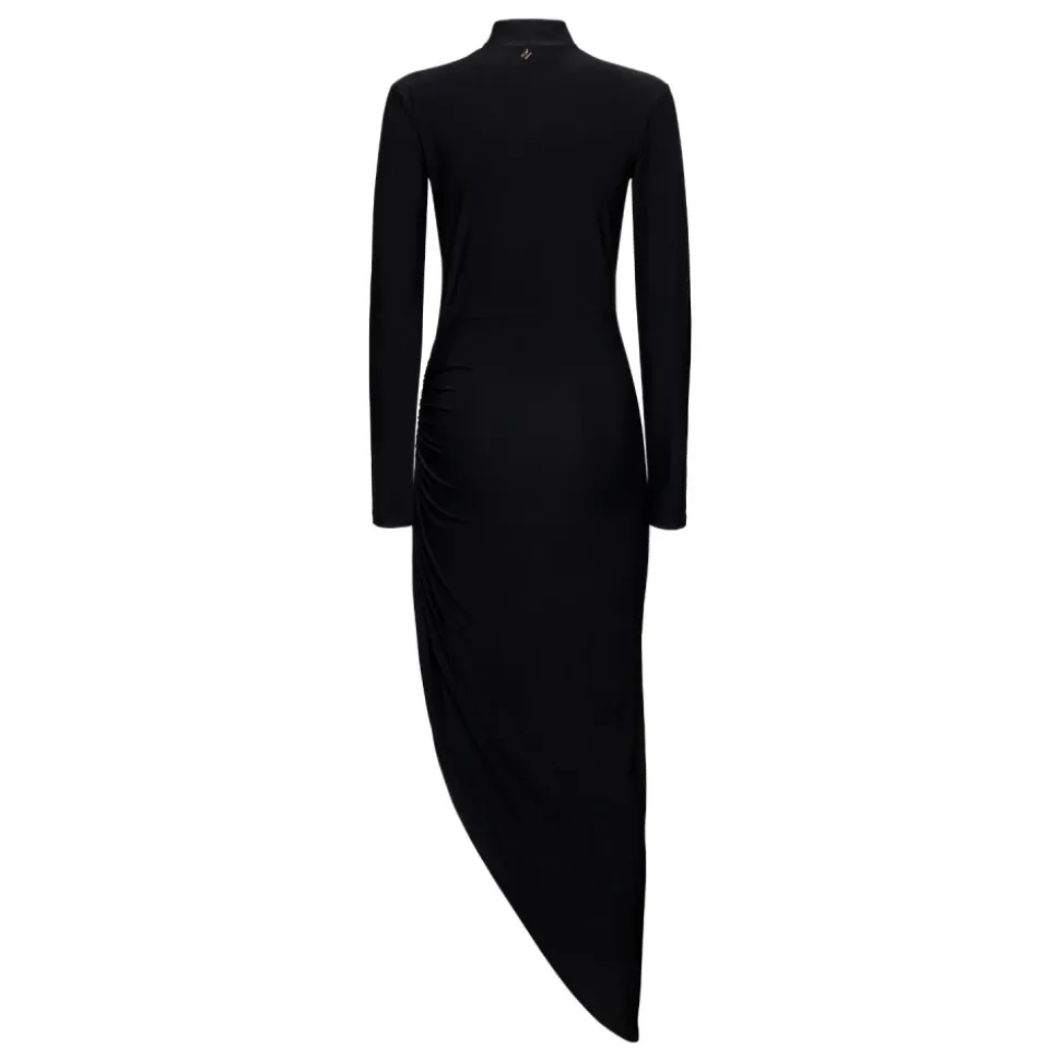Silvian Heach Kirundo Dress er en figursyet lang kjole, der defineres af asymmetrisk drapering og en dramatisk kant. Designet til aftenbegivenheder fremhæver den silhuetten med rynkede detaljer og en elegant høj halsudskæring. Vigtige egenskaber: Sort | Nero | Polyester | Høj elasticitet | Bevægelsesfrihed | Høj halsudskæring | Sidedrapering | Asymmetrisk kant | Rynke-/rynkede detaljer | Figursyet silhuet | Mål og pasform: Længde: 82/132 cm (størrelse 36) | Underarmsbredde: 41 cm (størrelse 36) | Taljebredde: 32 cm (størrelse 36) | Hoftebredde: 49 cm (størrelse 36) | Figursyet silhuet | Høj elasticitet for komfortabel pasform | Sammensætning og pleje: 94% Polyester | 6% Elastan