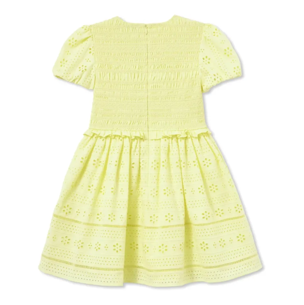 KJOLE MED ÅBEN ARBEJDSSLUSSING fortryller med subtil elegance og en enestående opmærksomhed på detaljer, karakteristisk for Self-Portrait Kids-mærket. Denne klassiske skæring fanger med sin svajede, rynkede nederdel og tilpassede top prydet med udsøgt smocking, som tilføjer lethed og sikrer en behagelig pasform. Kjolen er lavet af høj kvalitet naturligt stof i en solrig gul farve, som harmonisk blander sig med det åbne arbejde, der er arrangeret i intrikate blomster og delikate prikker. Små oppustede detaljer på de korte ærmer og en dekorativ, sanselig bue i taljen fremhæver charme og barnlig glæde, hvilket forstærker den æstetiske appel af denne kreation. HVORFOR VÆLGE DETTE PRODUKT? * Unikke åbne arbejdsudsmykninger afspejler enestående opmærksomhed på detaljer * Høj kvalitet naturligt stof sikrer behagelig brug * Elastisk smocket top tilbyder en perfekt pasform * Subtile afslutninger og en dekorativ bue fremhæver kjolens eksklusive karakter * Et ideelt valg til særlige lejligheder såvel som hverdagsstil