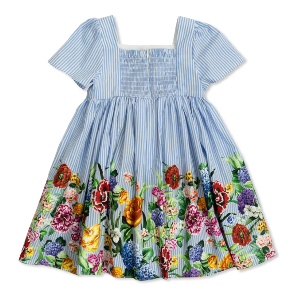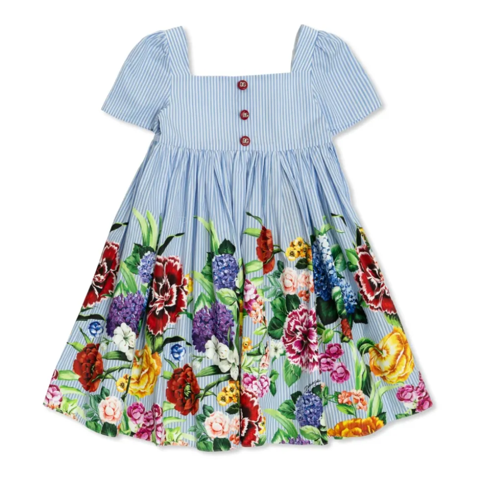 Præsenterer en BLUMSTRET KJOLE fra den eksklusive Dolce & Gabbana Kids kollektion, der introducerer små modeentusiaster til den italienske stil. Denne unikke kreation kombinerer elegance med piget charme takket være dens KORTE ÆRMER, KVADRATISK HALSUDSKÆRING og A-FORMET DESIGN. Den dominerende BLÅ FARVE med subtile hvide striber fungerer som baggrund for den nederste del af kjolen, der er prydet med livlige, farverige blomster i nuancer af rød, lilla, gul og grøn. Lavet af let, behageligt bomuld sikrer kjolen bærbarhed. Foran er der røde knapper med indgraveret DG logo, der understreger mærkets luksuriøse karakter. Elastikpanel på bagsiden sikrer en perfekt pasform til piger i alderen 4 til 14 år. HVORFOR SKAL DU KØBE DETTE PRODUKT? * Ikonisk Dolce & Gabbana stil. * Lavet af høj kvalitet bomuld. * Elegant, piget design. * Unikke detaljer som røde knapper med logoet. * Perfekt pasform takket være elastikpanelet.
