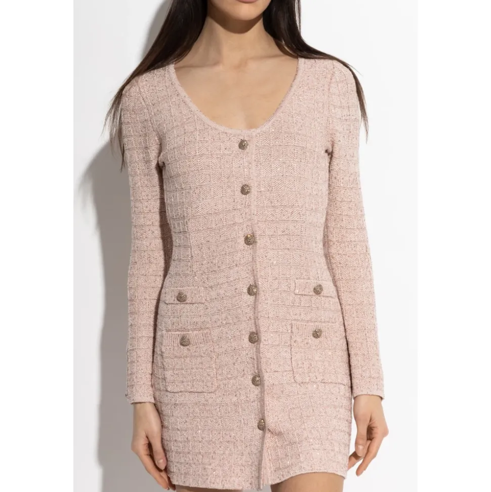 Alessandra Rich-kjole med glitrende pynt kombinerer en figursyet mini-silhuet med smykkeinspirerede detaljer, hvilket gør den til et raffineret valg til polerede dags- og aftenlooks. Nøgleattributter: Pink | Uld | Fire dekorative lommer foran | Knapbesatte manchetter | Rund halsudskæring | Lange ærmer | Tweed/bouclé-stil tekstur med subtilt skær | Smykkelignende metalliske knapper og indviklet pynt | Fire dekorative lommer foran | Mål og pasform: Modelhøjde: 177 cm | Modelbuste: 83 cm | Model talje: 61 cm | Model hofter: 89 cm | Modellen er iført størrelse: 40 | Figursyet mini-silhuet | Skræddersyet pasform, der fremhæver figuren | Sammensætning og pleje: Uld | Polyester | Må kun renses