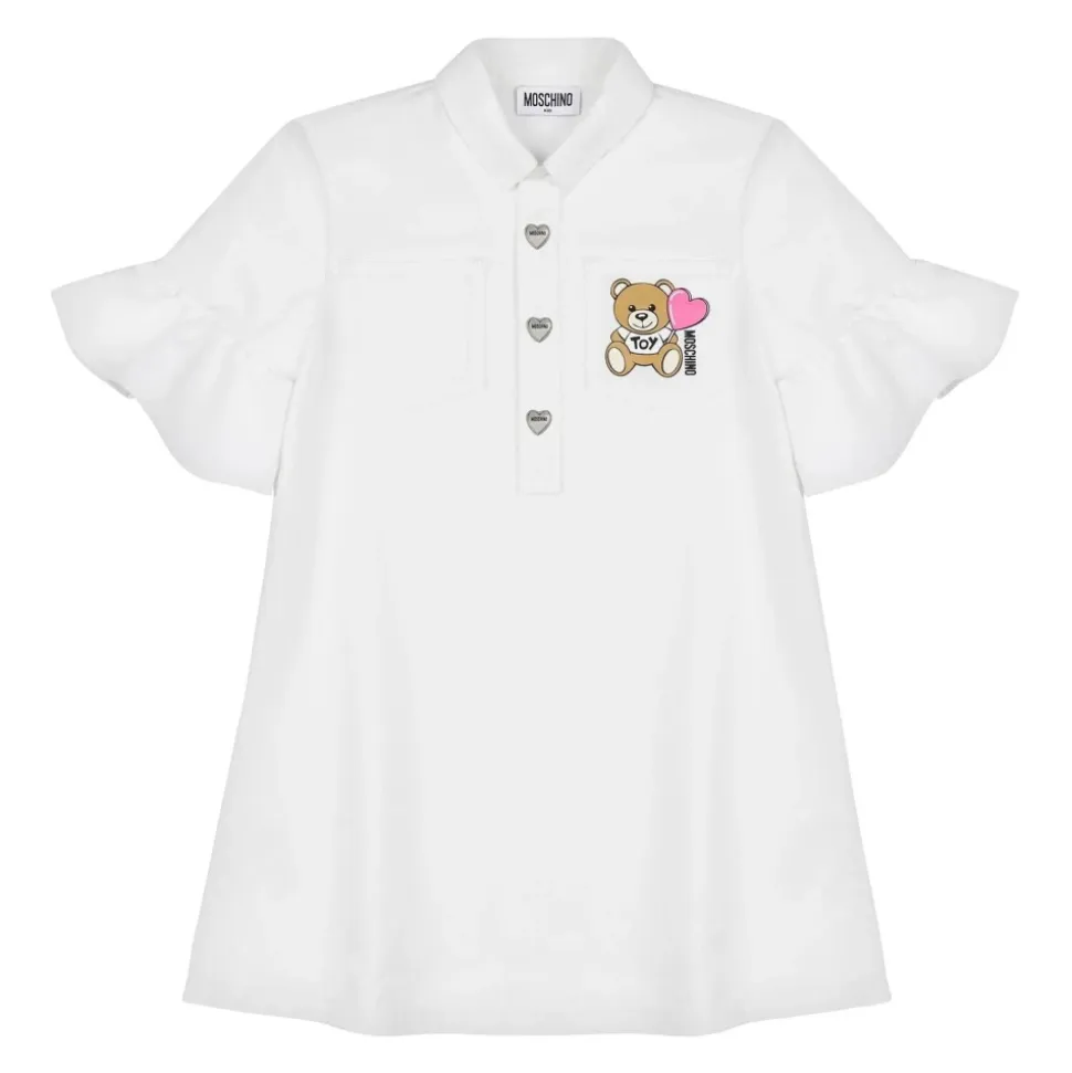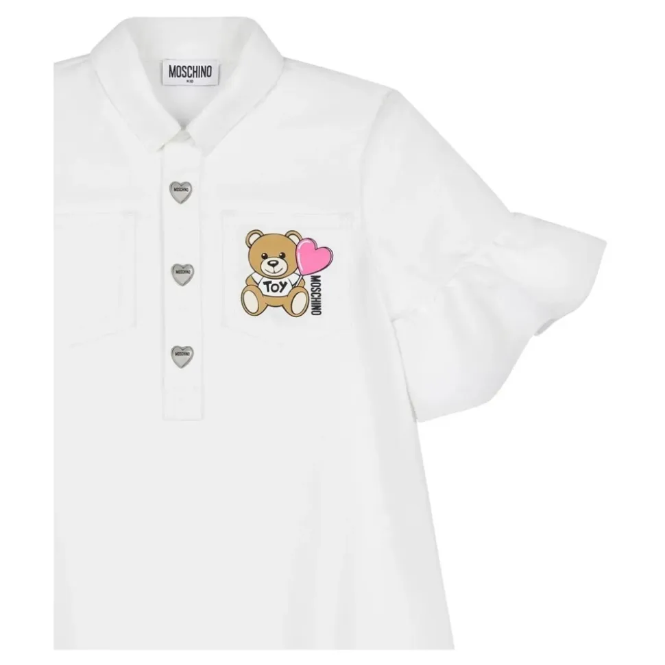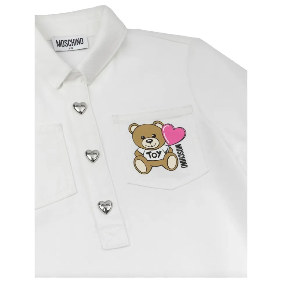 Moschino kjole, der kombinerer raffineret skrædderarbejde med en legesyg polo-krave med Teddy Bear-print, designet til et casual-chic look, der er egnet til hverdagsbrug og særlige lejligheder. Vigtige egenskaber: Hvid | Bianco | Bomuld | Blød fornemmelse | Letvægtsstof | Knaplukning foran | Brystlommer | Polo-krave med Teddy Bear-print | Knaplukning foran | Brystlommer | Raffineret finish og skræddersyede detaljer | Sammensætning og pleje: 100% bomuld | Undgå rensning. Må ikke tørretumbles. Brug ikke blegemiddel. Brug et mildt vaskemiddel til farvet tøj uden blegemiddel. Stryg ved højst 110°C og undgå damp. Følg vaskeanvisningen inde i tøjet.