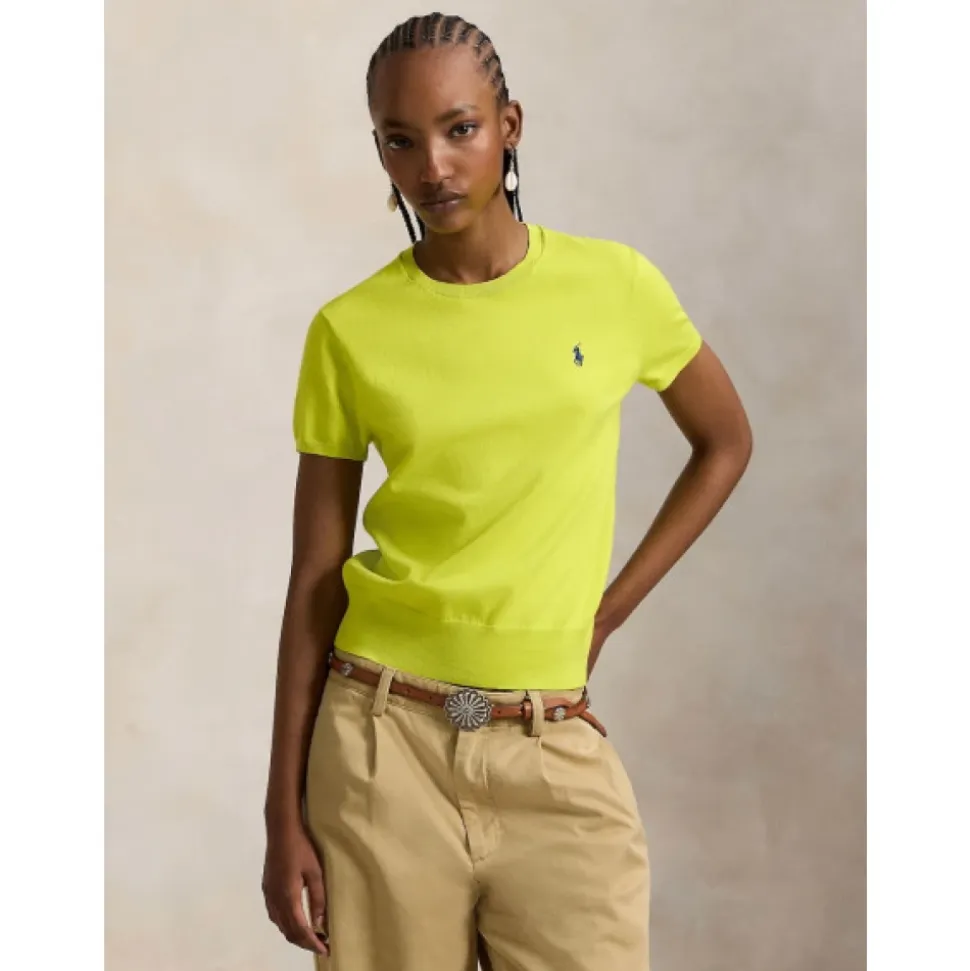 Polo Ralph Lauren kortærmet, finstrikket top i Peridot grøn, fremstillet af en pima bomuldsblanding for et let, raffineret lag. Nøgleattributter: Grøn | Peridot grøn | Pima bomuld | Let | Rund halsudskæring | Korte ærmer | Ribkant ved krave, ærmer og kant | Broderet polo spiller logo på venstre bryst | Dimensioner & pasform: Lige snit | Modelhøjde 1,78 m, bruger størrelse S. | Sammensætning & pleje: 81% bomuld | 16% nylon | 3% elastan