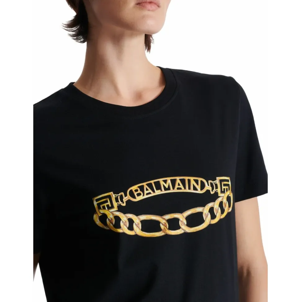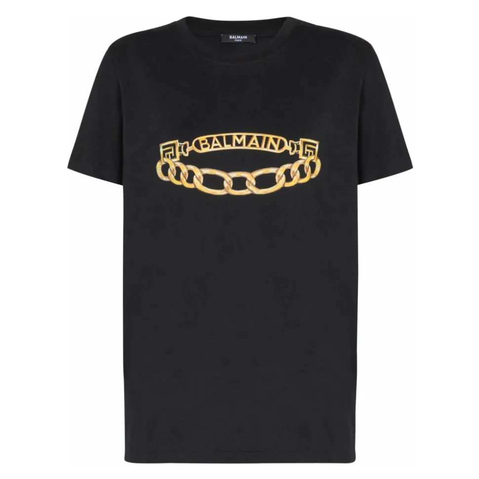 Trykt Balmain Chain-logo T-shirt Rund hals med ribkant Korte ærmer Balmain Chain-logo trykt på forsiden Almindelig pasform Model måler 178 cm og bruger en størrelse S Hovedmateriale: 100% bomuld Lavet i Portugal Vare: FF1EF004GE97 100% af bomuldsfibrene, der bruges til at lave dette tøj, er certificeret og dyrket