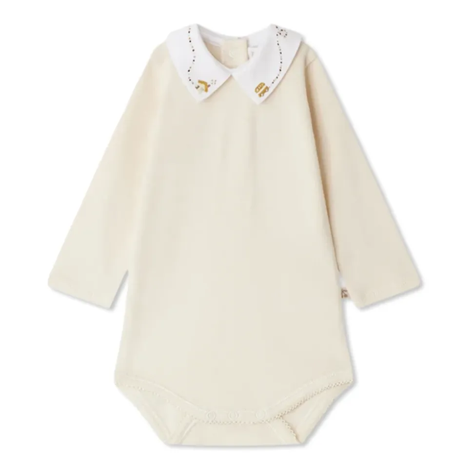 KRAVEDE BODYSUIT fra Bonpoint er essensen af subtil, raffineret elegance, skabt med de yngste i tankerne. Den klassiske, skræddersyede pasform med lange ærmer og en omhyggeligt færdig snow-white krave prydet med gylden broderi fremhæver produktets tidløse karakter. Udelukkende lavet af blød bomuld, præsenterer den sig selv ekstraordinært yndefuldt i en cremet nuance, mens den enkle snit gør den til et universelt valg til enhver lejlighed. Diskrete trykknapper i skridtet giver praktiske og hurtige ble-skift uden at forstyrre harmonien i det hele. Bonpoint, et forbillede for fransk excellence, lægger vægt på hver eneste detalje, der blander materialernes delikatesse med enestående æstetik. HVORFOR VÆLGE DETTE PRODUKT? * Luksuriøst, naturligt materiale skånsomt mod et barns hud * Unik dekorativ krave med indviklet broderi * Praktisk, diskret tryklukning * Unikt design i ånden af fransk tradition * Elegant minimalisme egnet til enhver lejlighed
