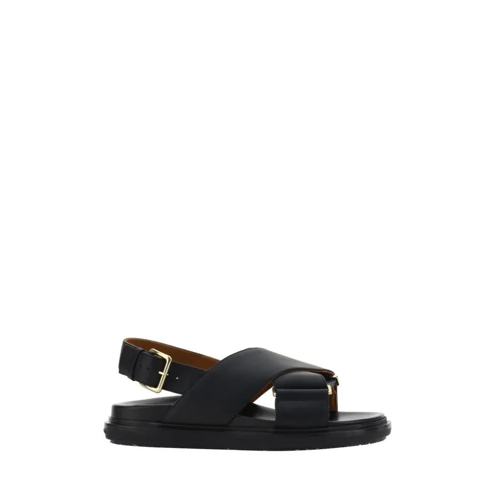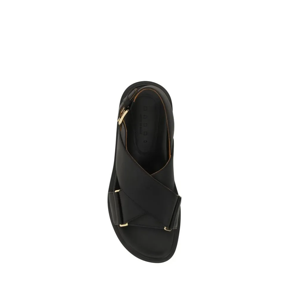 Træd ind i komfort og stil med Marnis læder Fussbett Sandaler til kvinder. Disse ikoniske flade sandaler har en dobbelt krydsende frontrem, åben tå og justerbar ankelrem for en sikker pasform. Den logo-prægede indersål tilføjer et strejf af luksus. Lavet i Italien af 100% kalveskind og gummi. Varenummer: FBMS015701P3614_00N99. Sæson: AW25.