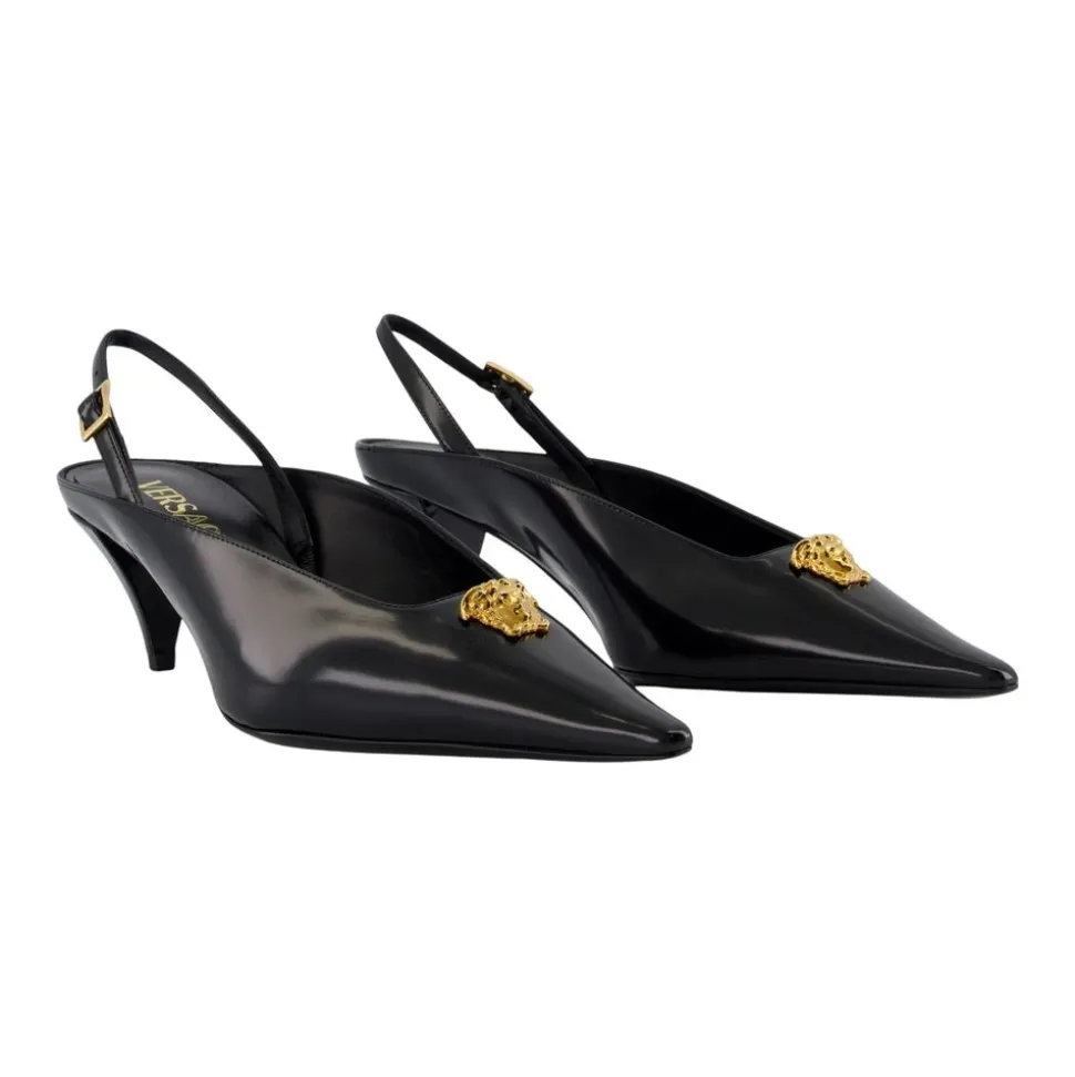 Versace La Medusa Slingback Pumps 55 mm er polerede pumps i kalveskind med den karakteristiske Medusa-hardware, designet til raffineret hverdags- og aftenbrug. Vigtige egenskaber: Sort | Versace guld | Glat kalveskind | Slip-on med justerbar ankelrem | Spids tå | Kittenhæl | La Medusa hardware | Poleret glat finish | Dimensioner og pasform: Hælhøjde: 55 mm | Passer normal i størrelsen (Europæiske størrelser) | Sammensætning og pleje: Ydre materiale: 100% kalvelæder | Foring 1: 100% lammeskind | Foring 2: 100% gedeskind | Trim: 100% lammeskind | Sål: 100% kalvelæder | Læs produktets etiket for detaljerede plejeinstruktioner. Professionel læderrens anbefales.