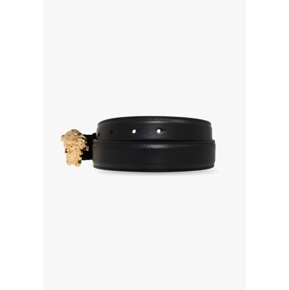 Sort bælte fra Versace. Lavet af kalveskind, dette element har en tredimensionel Medusa-spænde i guldfarve.Translation: Sort bælte fra Versace. Lavet af kalveskind, dette element har en tredimensionel Medusa-spænde i guldfarve.