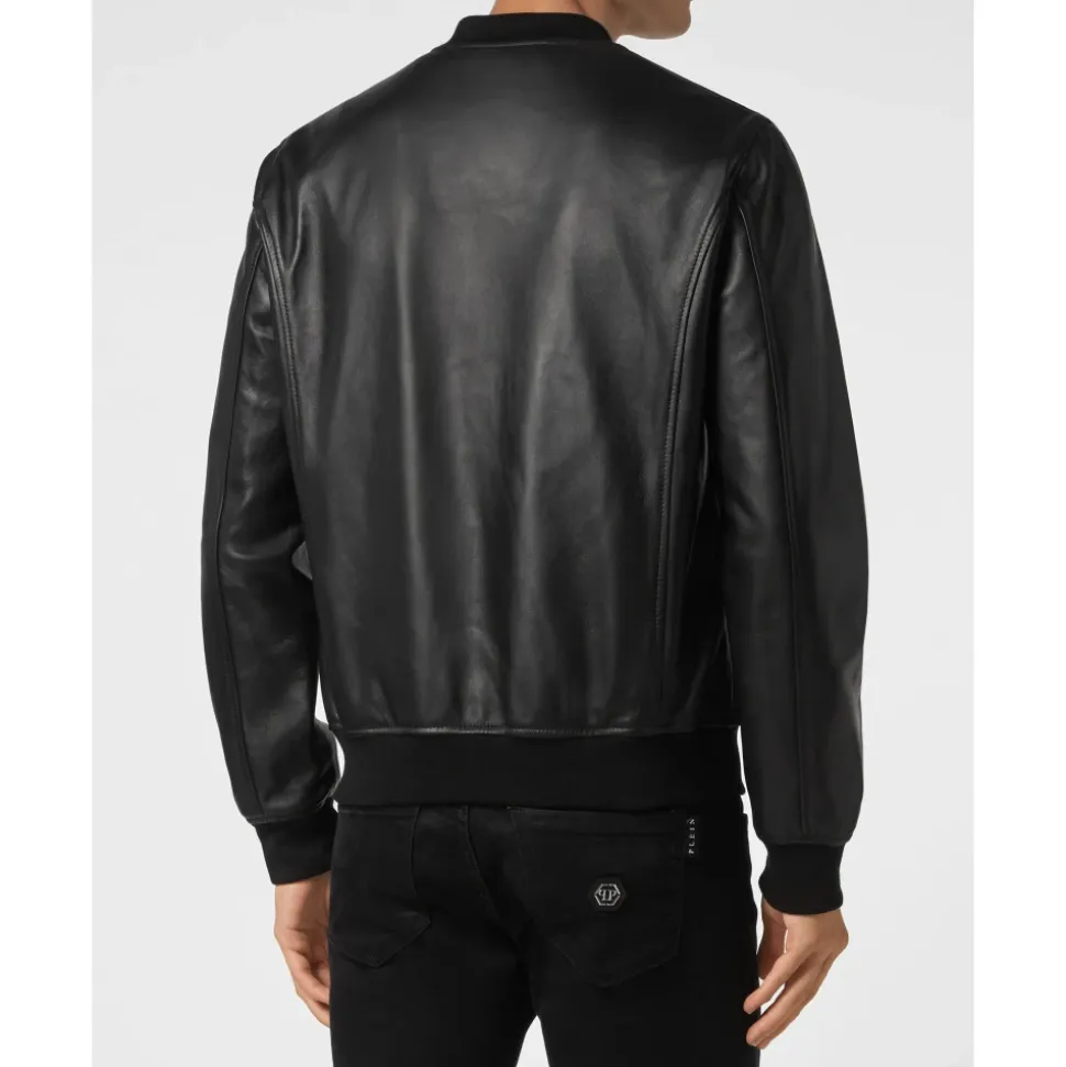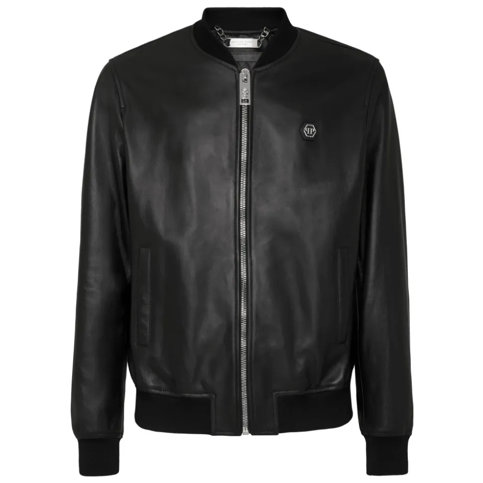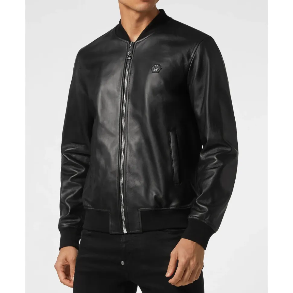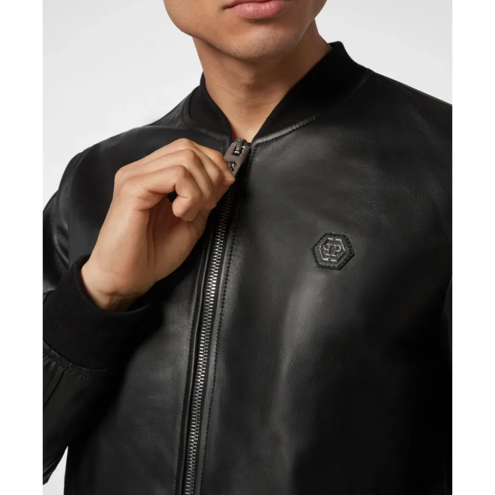 Philipp Plein Læderbomberjakke er en moderne nappa læderjakke, der kombinerer en blød følelse med karakteristiske brandingdetaljer. Den skiller sig ud med sit PP Hexagon saffian lædermærke på brystet og klassiske bomberjakkesilhuet. Vigtige egenskaber: Sort | Nappalæder | Lynlåslukning | To stiklommer med skjult trykknap | Ribstrikkede kanter | Indvendig foring | PP Hexagon saffian lædermærke på venstre bryst | Bomberjakkesilhuet | Blød nappa finish | Sammensætning og pleje: Ydermateriale: 100% lammeskind | Foring: 100% polyester | Ribstrik: 98% polyester, 2% elastan