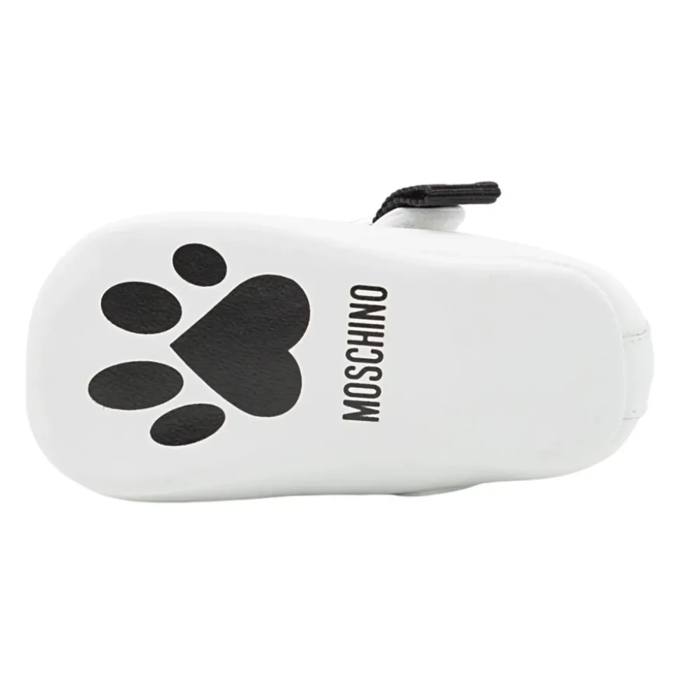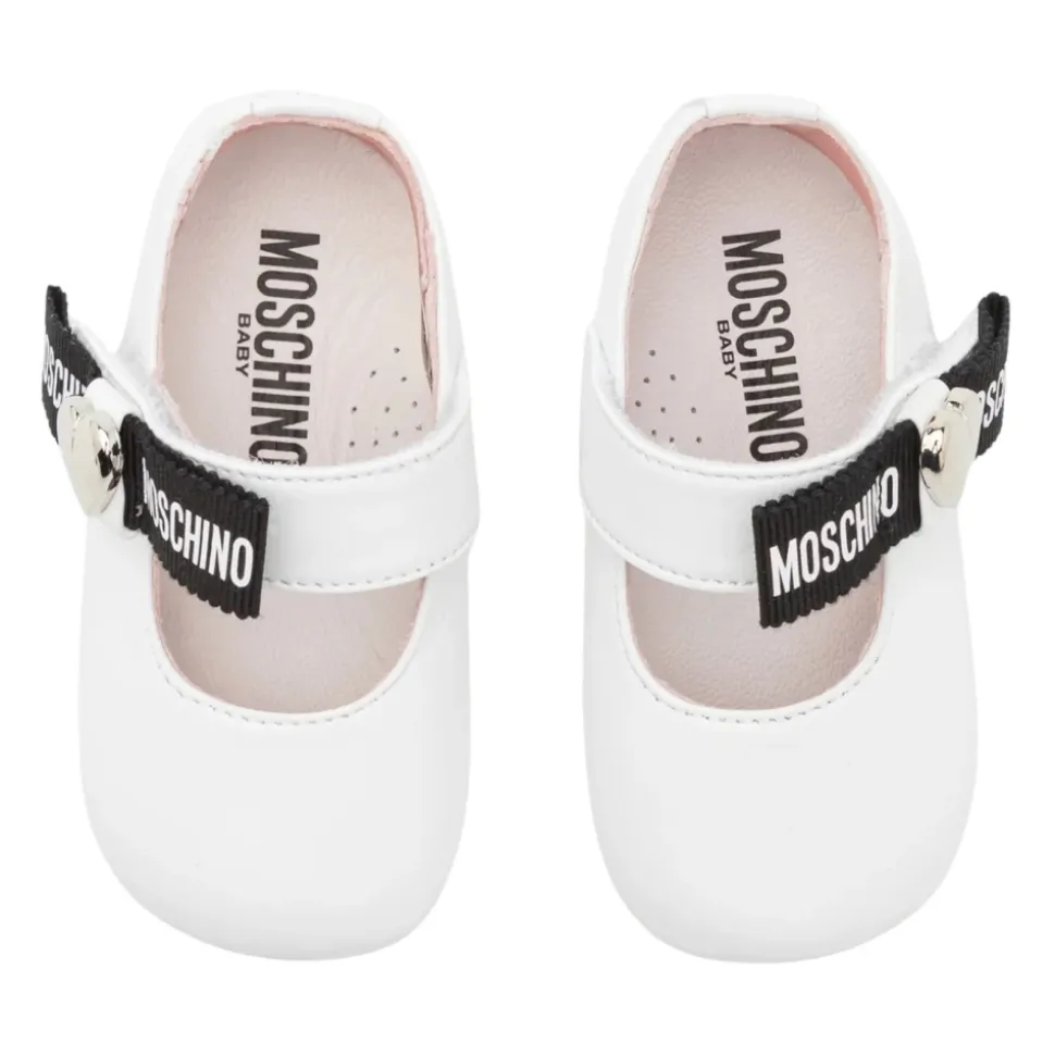 Moschino laminerede Nappa ballerina sko opdaterer en klassisk ballerinaform med en grosgrain sløjfe, logo og metalhjerte for en signaturfinish. Designerkode: MNT80388MK440 (80388/PIABIANCO). Nøgleattributter: Hvid | Læder | Velcrolukning | Grosgrain sløjfe | Logo detalje | Metalhjerte på siden | Trykt logo på sålen | Fremstillet i Italien | Dimensioner & pasform: Europæiske størrelser | Sammensætning & pleje: Overdel: 100% gedeskind | Foring: læder | Sål: lædersål med præg
