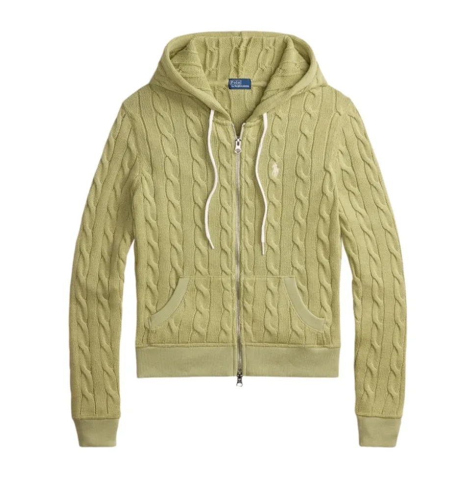Polo Ralph Lauren Langærmet Hoodie med Fuld Lynlås kombinerer en kabelstrikket konstruktion med en silhuet med lynlås, hvilket gør den nem at bruge i lag. Designet til fritidsbrug, har den en hætte og lommer for praktisk hverdagsbrug. Vigtige egenskaber: Grøn | Bomuld | Fuld lynlåslukning foran | Hætte med snøre | Forlommer | Kabelstrikket tekstur | Ribkant forneden og manchetter | Lange ærmer | Hætteudskæring | Sammensætning & pleje: 100% bomuld